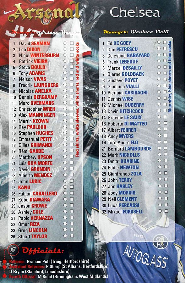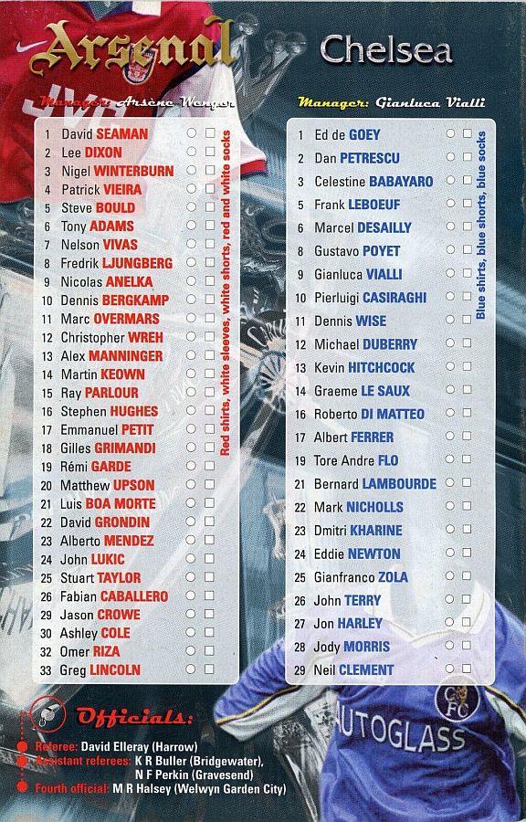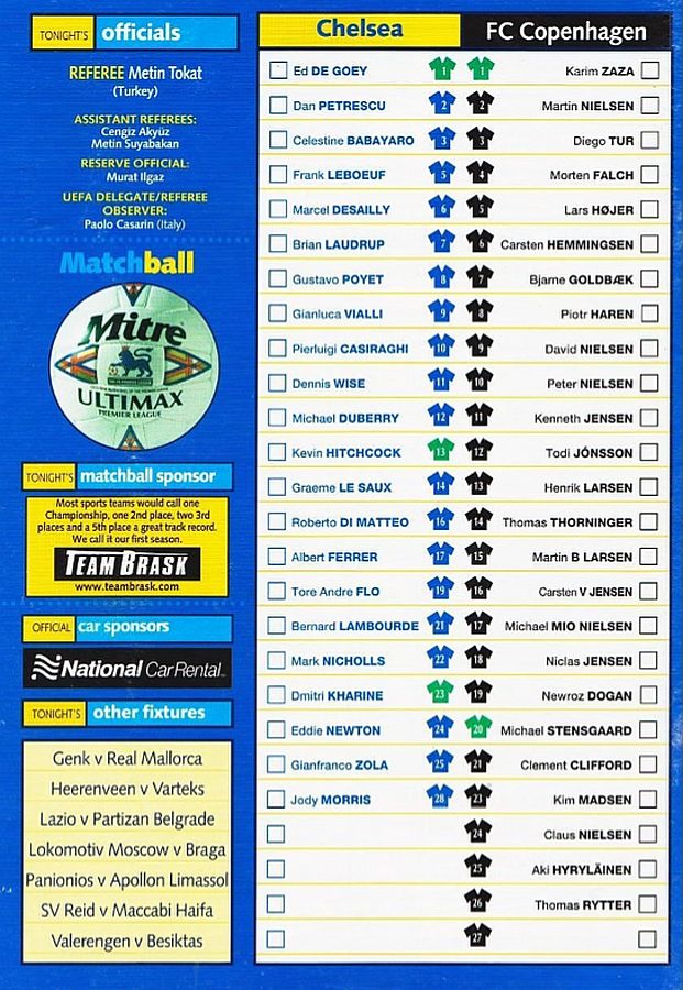 1 Eduard De Goey, 2 Dan Petrescu, 5 Frank Leboeuf, 6 Marcel Desailly, 8 Gus Poyet, 11 Dennis Wise, 14 Graeme Le Saux, 17 Albert Ferrer, 19 Tore Andre Flo (16 Roberto DiMatteo 82), 25 Gianfranco Zola (32 Mikael Forssell 89), 28 Jody Morris ( 7 Bjarne Goldbaek 66) |
