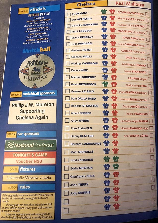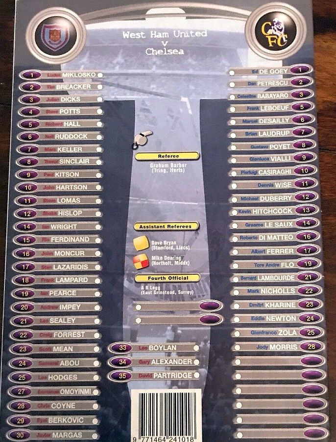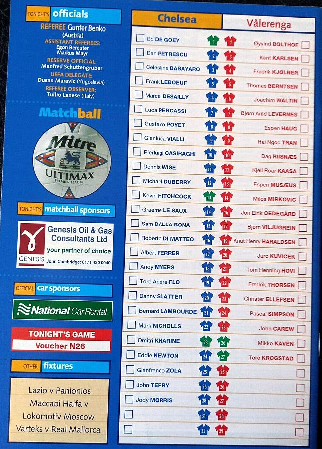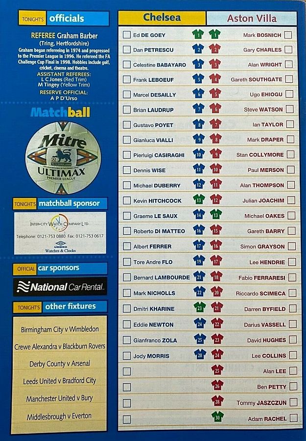 1 Eduard De Goey, 2 Dan Petrescu (28 Jody Morris 78), 5 Frank Leboeuf, 6 Marcel Desailly, 8 Gus Poyet, 11 Dennis Wise, 14 Graeme Le Saux ( 3 Celestine Babayaro 45), 16 Roberto DiMatteo, 17 Albert Ferrer, 19 Tore Andre Flo, 25 Gianfranco Zola |