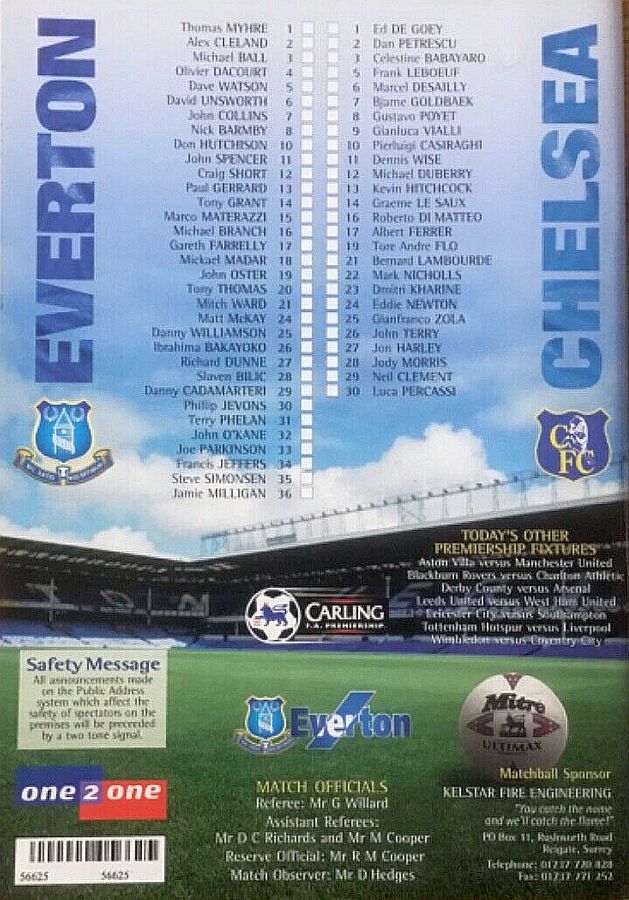 Thomas Myhre, Craig Short, Richard Dunne (Peter Degn 46), David Unsworth, David Weir, Nick Barmby, Mitch Ward (Danny Cadamarteri 71), Don Hutchison, Michael Ball, Kevin Campbell, Francis Jeffers |