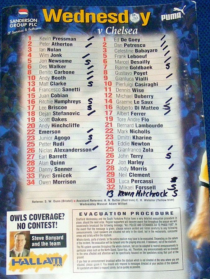 13 Kevin Hitchcock, 3 Celestine Babayaro, 5 Frank Leboeuf, 6 Marcel Desailly, 8 Gus Poyet (24 Eddie Newton 59), 9 Gianluca Vialli, 11 Dennis Wise, 17 Albert Ferrer, 21 Bernard Lambourde, 32 Mikael Forssell (25 Gianfranco Zola 46), 7 Bjarne Goldbaek |
