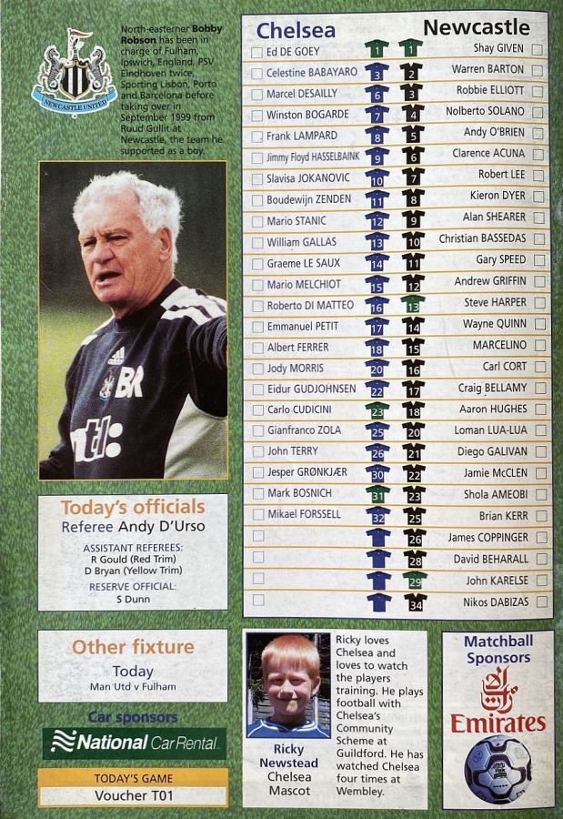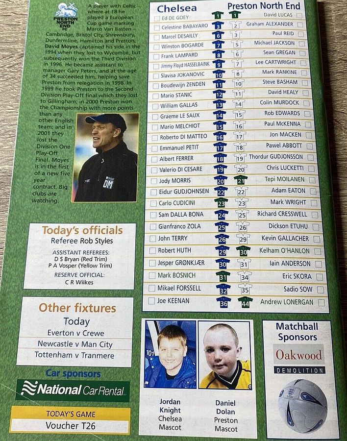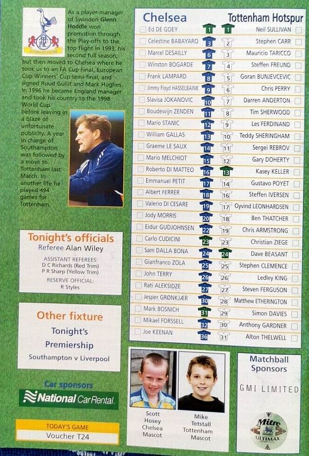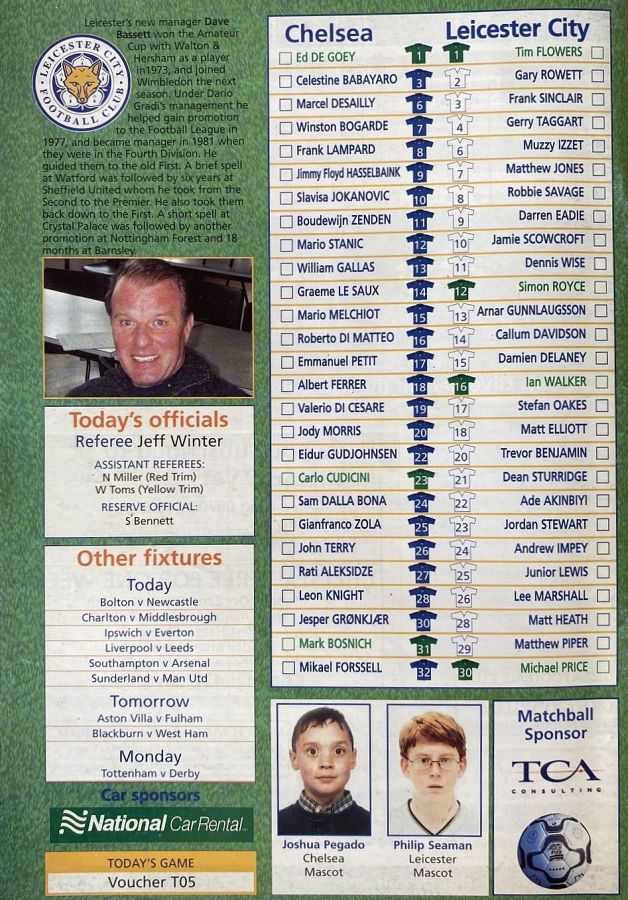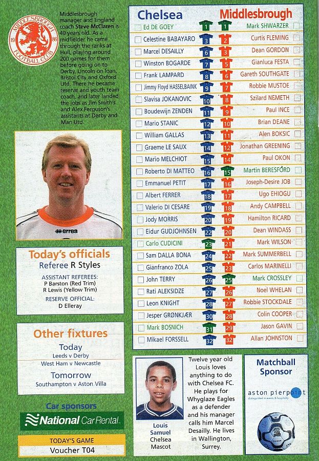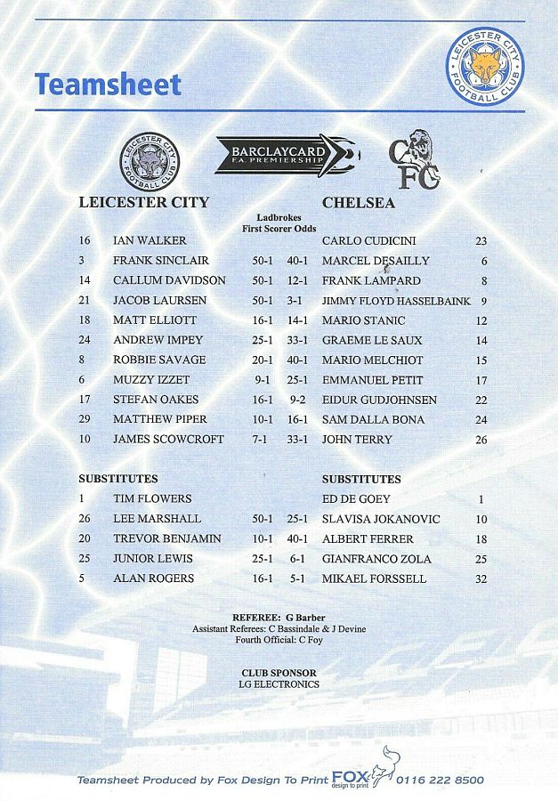 1 Eduard De Goey, 3 Celestine Babayaro (14 Graeme Le Saux 78), 6 Marcel Desailly, 8 Frank Lampard (20 Jody Morris 69), 9 Jimmy Floyd Hasselbaink, 10 Slavisa Jokanovic, 11 Bollo Zenden (25 Gianfranco Zola 89), 13 William Gallas, 15 Mario Melchiot, 22 Eidur Gudjohnsen, 26 John Terry |