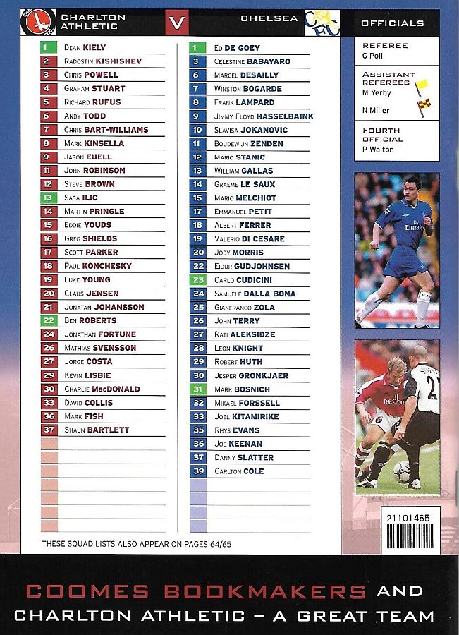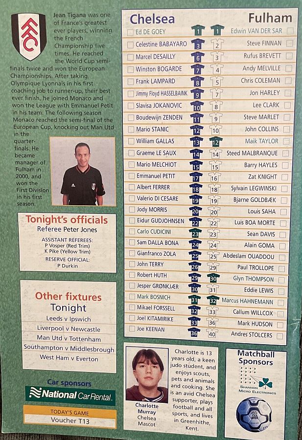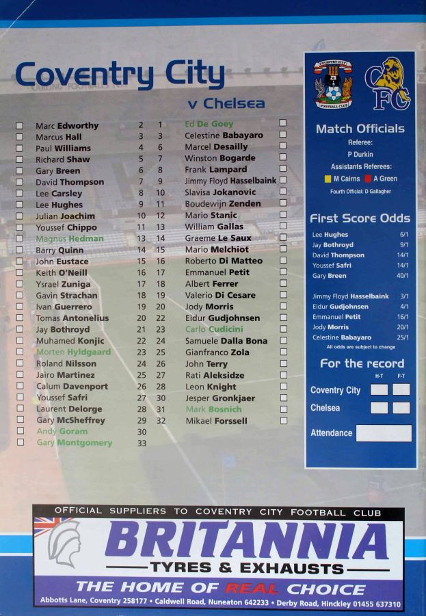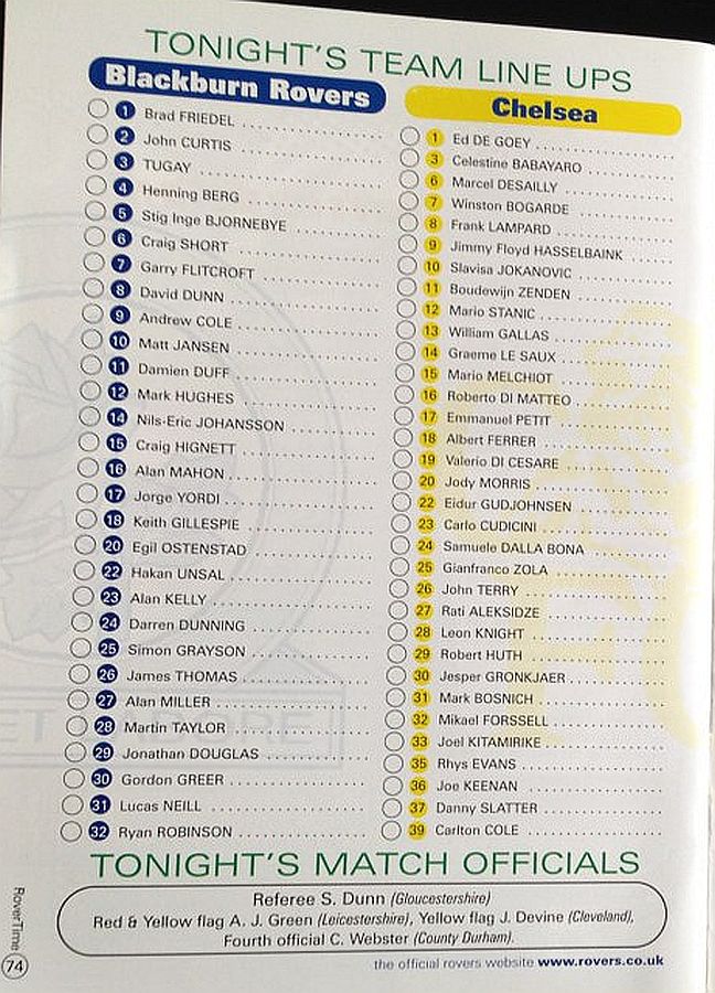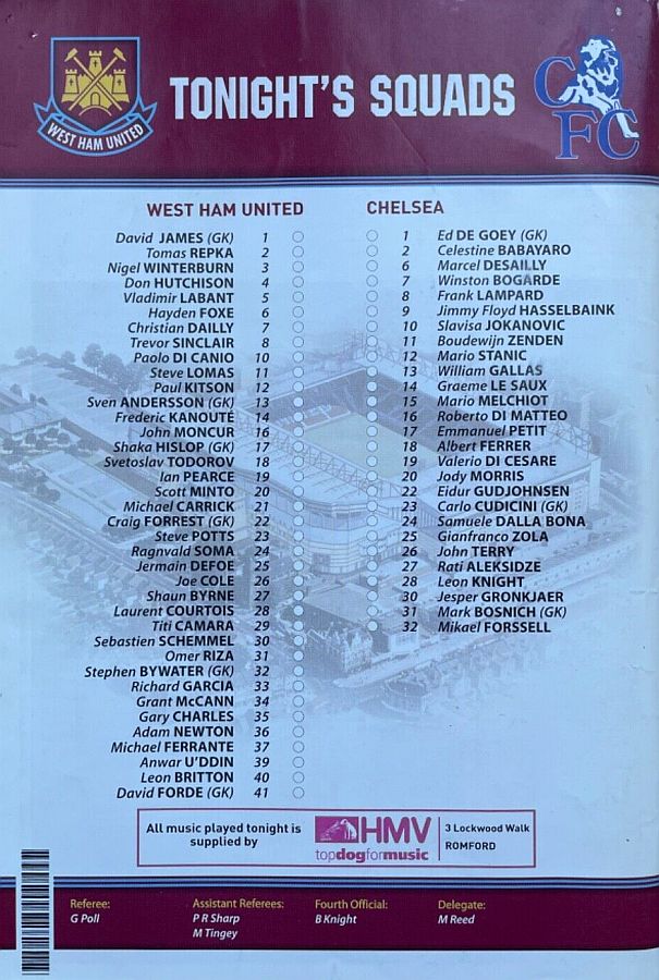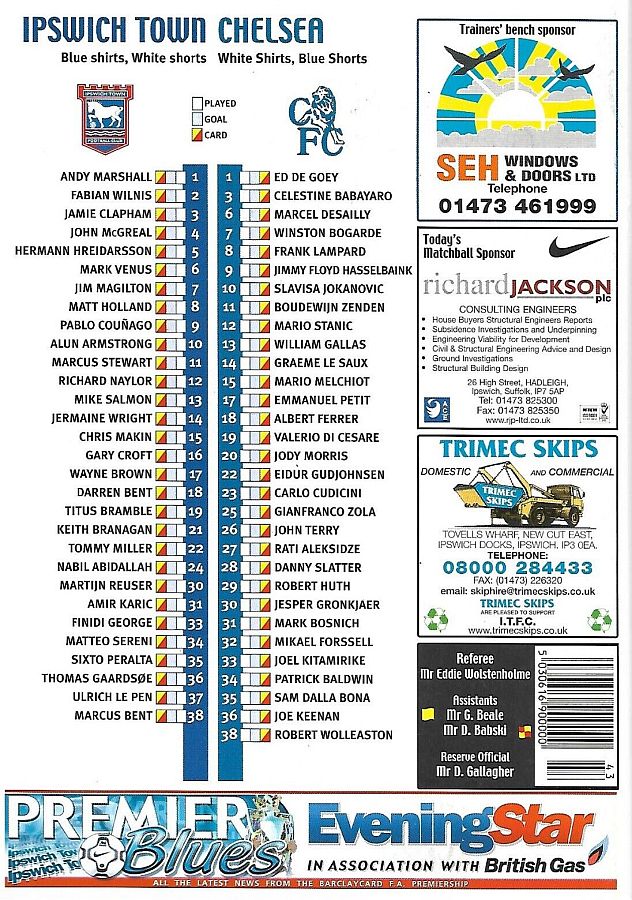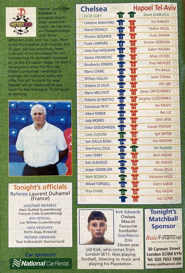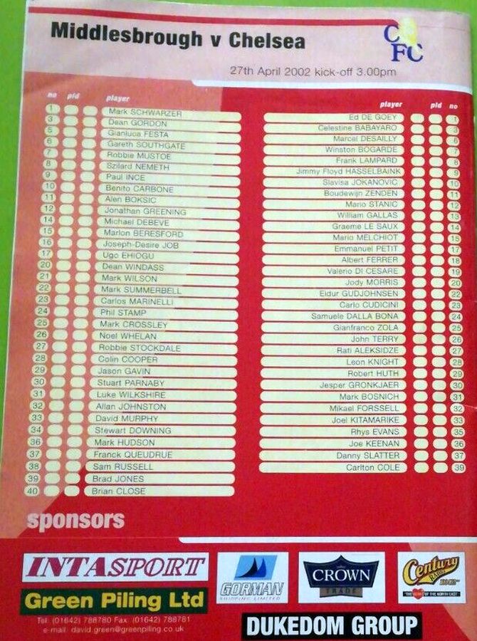 23 Carlo Cudicini, 8 Frank Lampard, 11 Bollo Zenden (24 Sam Dalla Bona 45), 13 William Gallas, 14 Graeme Le Saux (22 Eidur Gudjohnsen 45), 15 Mario Melchiot, 17 Emmanuel Petit, 25 Gianfranco Zola, 26 John Terry, 30 Jesper Gronkjaer (29 Robert Huth 45), 39 Carlton Cole |