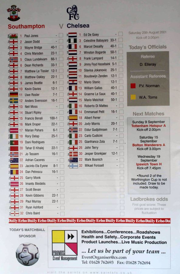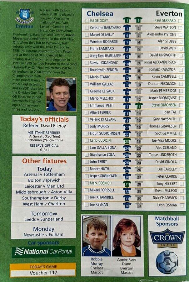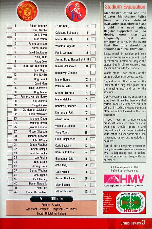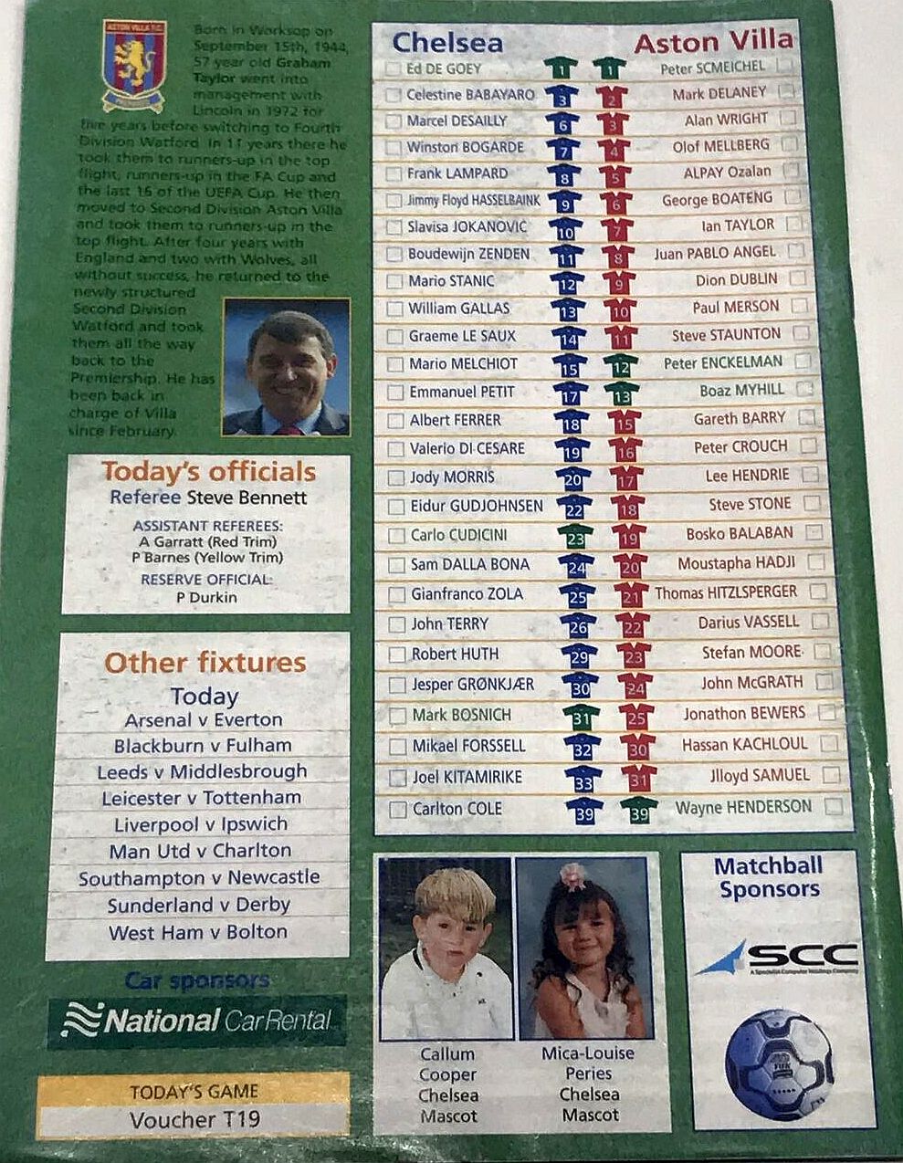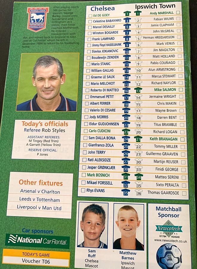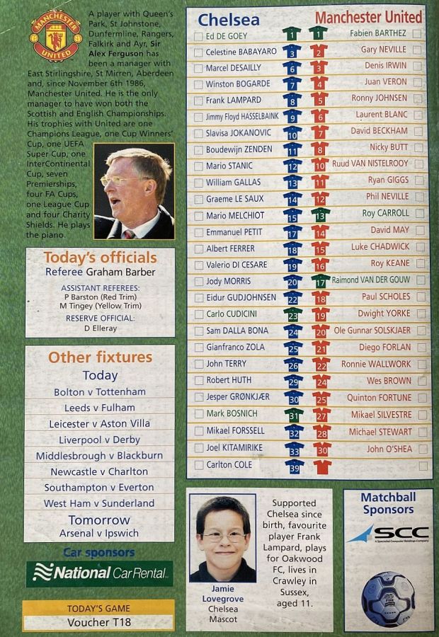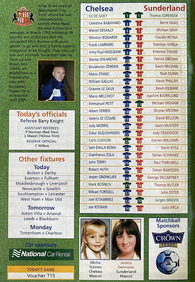 23 Carlo Cudicini, 8 Frank Lampard, 11 Bollo Zenden (24 Sam Dalla Bona 45), 13 William Gallas, 14 Graeme Le Saux (22 Eidur Gudjohnsen 45), 15 Mario Melchiot, 17 Emmanuel Petit, 25 Gianfranco Zola, 26 John Terry, 30 Jesper Gronkjaer (29 Robert Huth 45), 39 Carlton Cole |