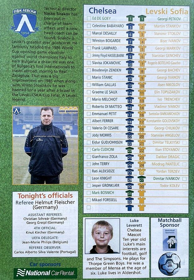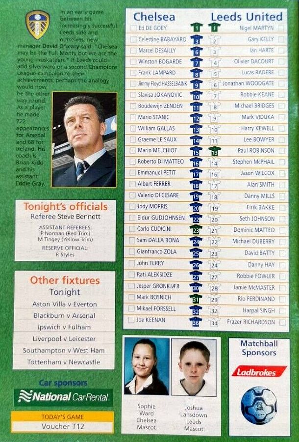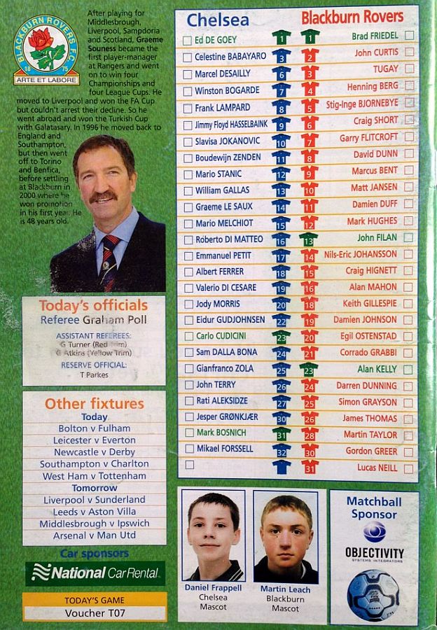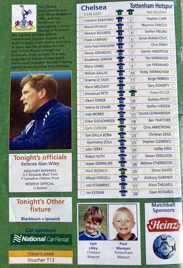 23 Carlo Cudicini, 6 Marcel Desailly, 8 Frank Lampard, 9 Jimmy Floyd Hasselbaink (10 Slavisa Jokanovic 85), 12 Mario Stanic (11 Bollo Zenden 76), 14 Graeme Le Saux (18 Albert Ferrer 4), 15 Mario Melchiot, 17 Emmanuel Petit, 22 Eidur Gudjohnsen, 26 John Terry, 30 Jesper Gronkjaer |