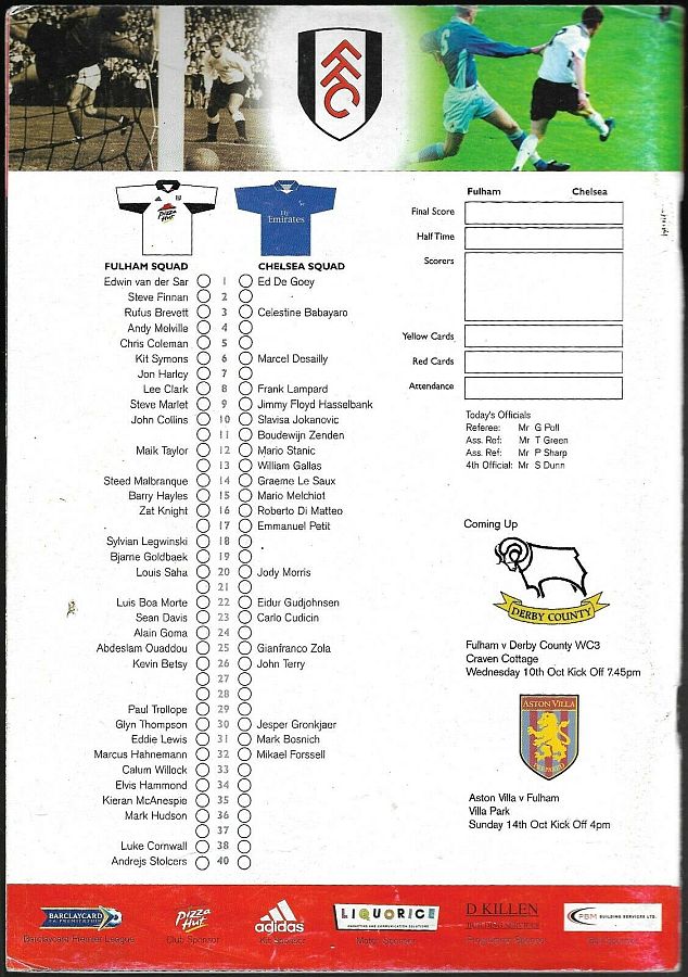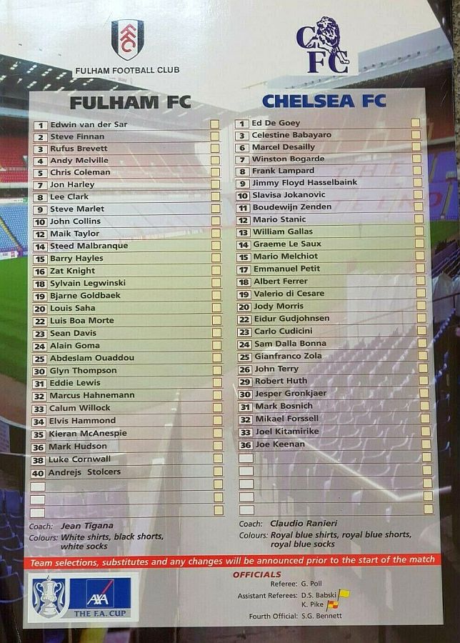Edwin van der Sar, Steve Finnan, Andy Melville, Alain Goma, Rufus Brevett, Steed Malbranque, Sean Davis, Sylvain Legwinski (Barry Hayles 87), John Collins (Luis Boa Morte 65), Louis Saha, Steve Marlet |