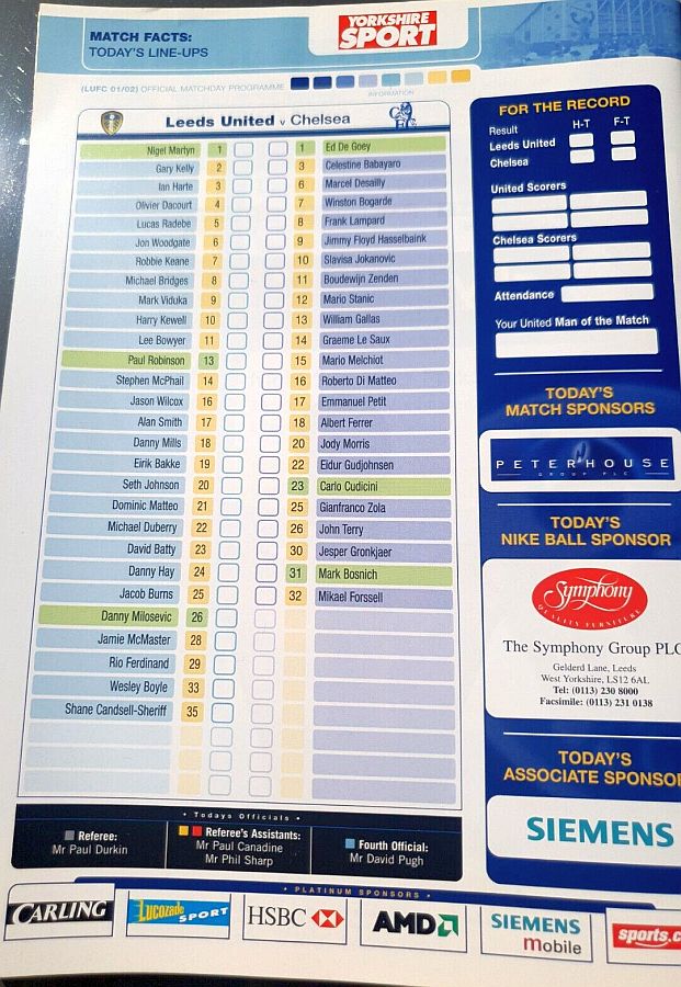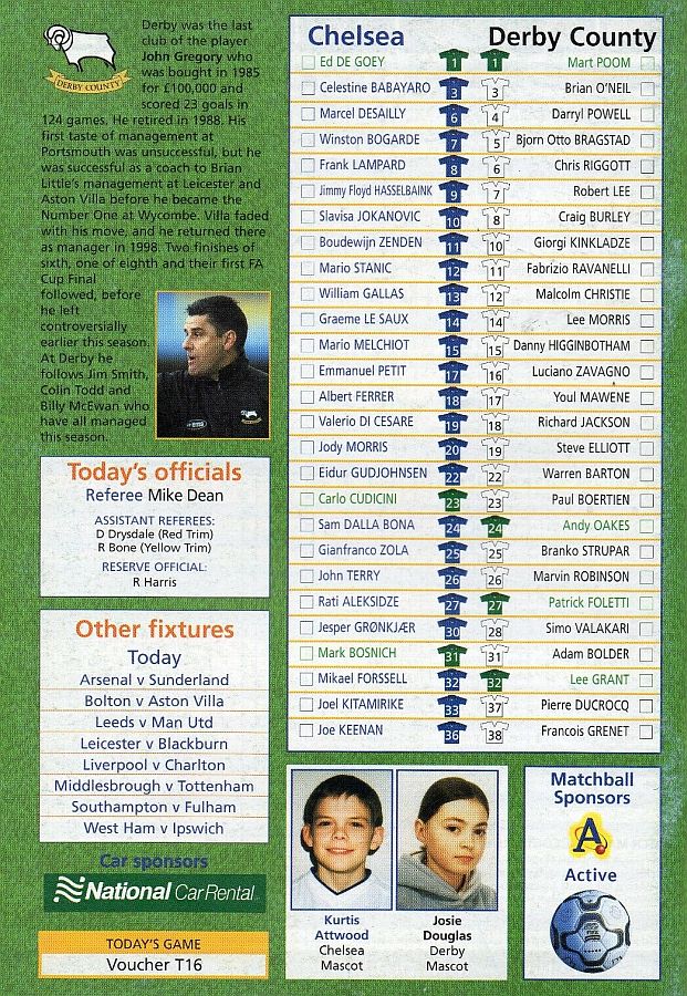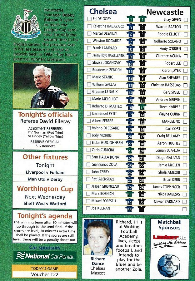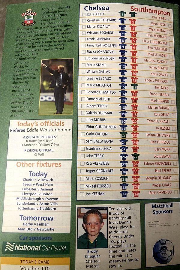 23 Carlo Cudicini, 6 Marcel Desailly, 9 Jimmy Floyd Hasselbaink, 10 Slavisa Jokanovic, 12 Mario Stanic (11 Bollo Zenden 60), 14 Graeme Le Saux, 15 Mario Melchiot, 24 Sam Dalla Bona ( 8 Frank Lampard 66), 25 Gianfranco Zola, 26 John Terry, 32 Mikael Forssell (22 Eidur Gudjohnsen 66) |