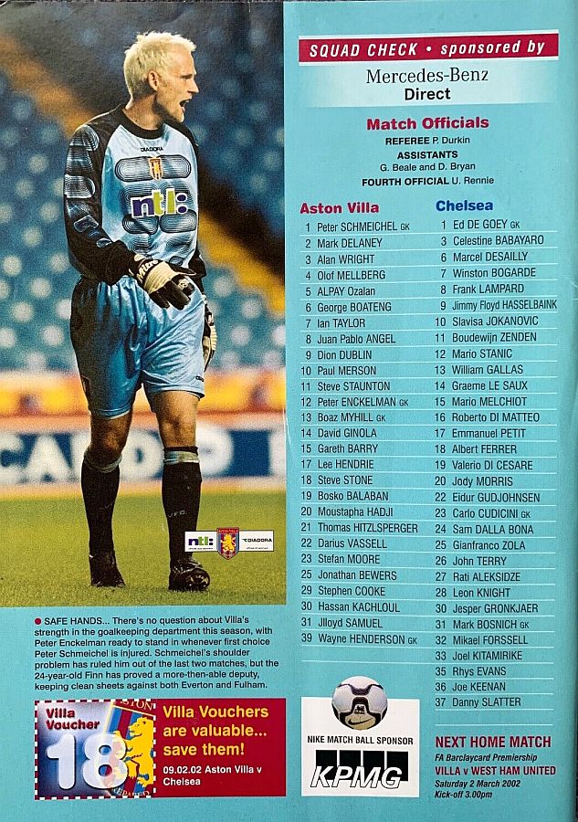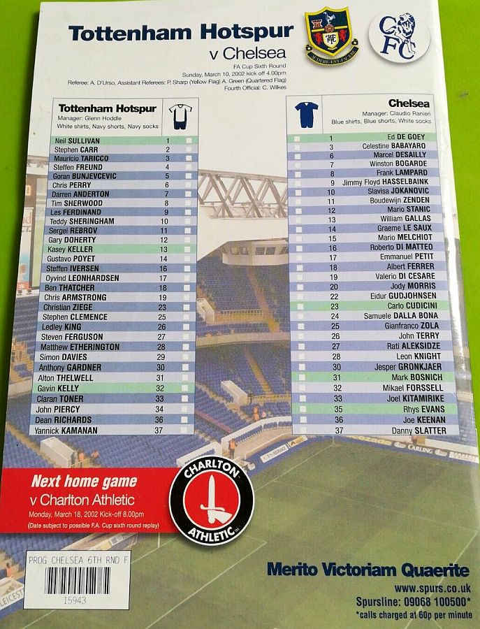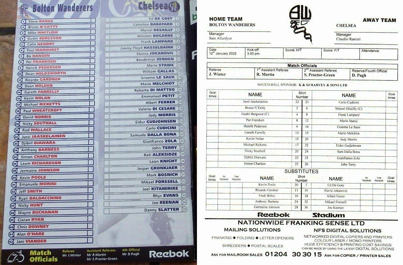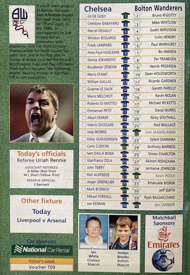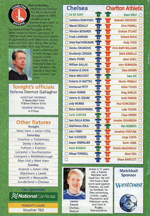 23 Carlo Cudicini, 6 Marcel Desailly, 8 Frank Lampard, 9 Jimmy Floyd Hasselbaink (39 Carlton Cole 77), 12 Mario Stanic, 14 Graeme Le Saux, 15 Mario Melchiot, 17 Emmanuel Petit (10 Slavisa Jokanovic 70), 22 Eidur Gudjohnsen, 25 Gianfranco Zola, 26 John Terry (11 Bollo Zenden 15) |