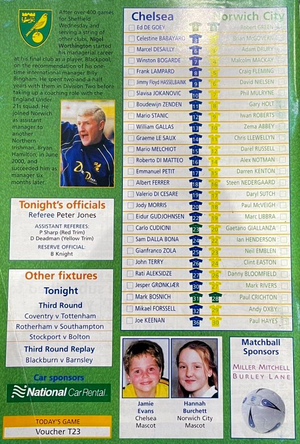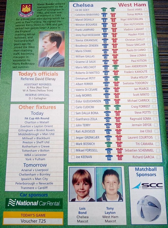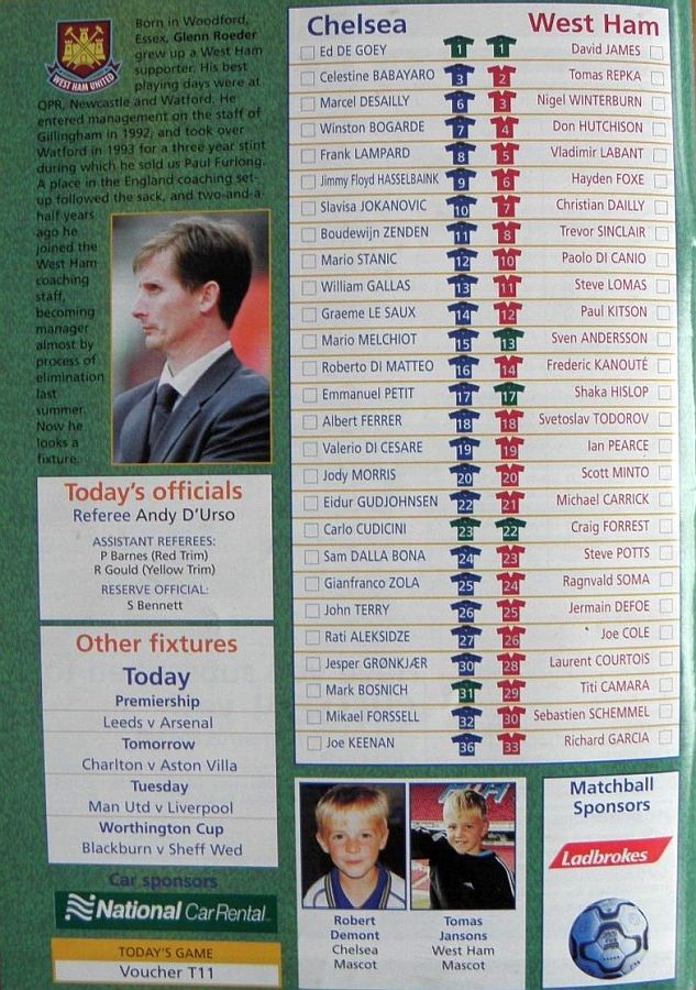 23 Carlo Cudicini, 6 Marcel Desailly, 8 Frank Lampard, 11 Bollo Zenden, 13 William Gallas, 15 Mario Melchiot, 17 Emmanuel Petit (10 Slavisa Jokanovic 70), 25 Gianfranco Zola, 26 John Terry, 30 Jesper Gronkjaer (24 Sam Dalla Bona 78), 39 Carlton Cole (12 Mario Stanic 75) |