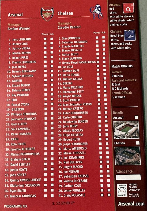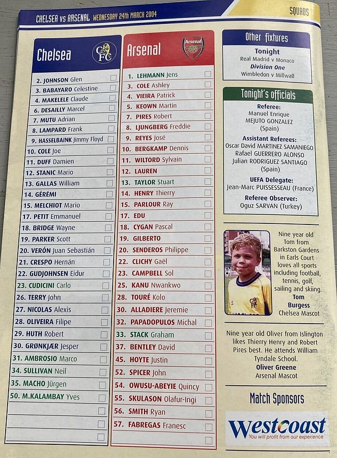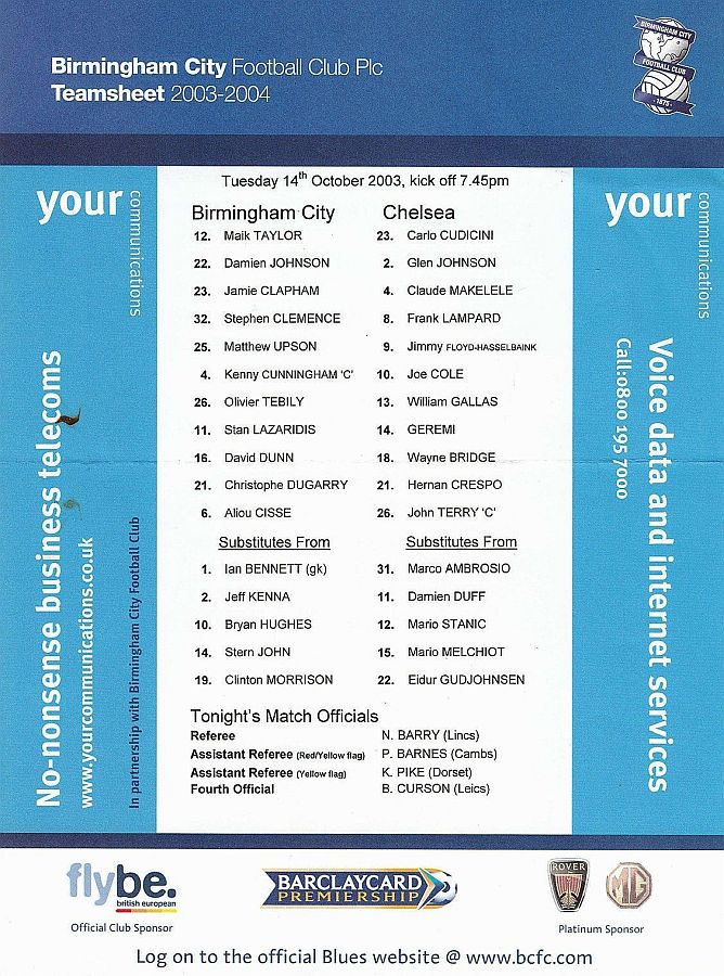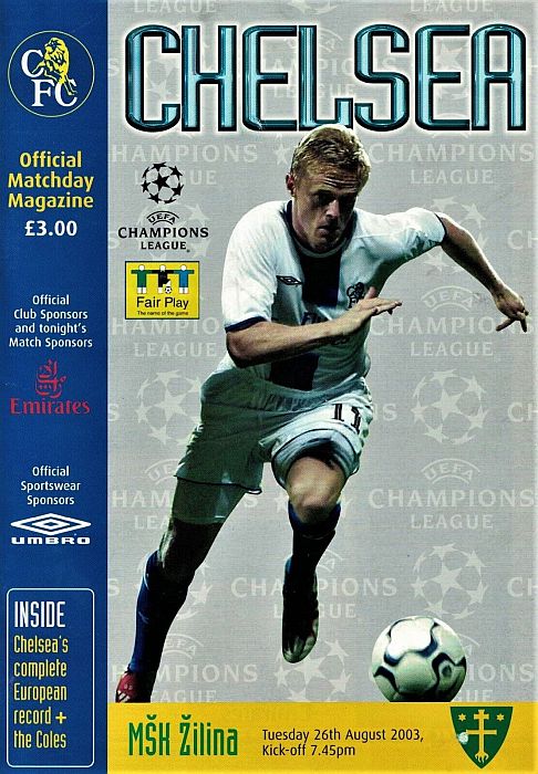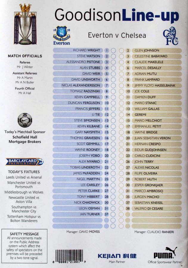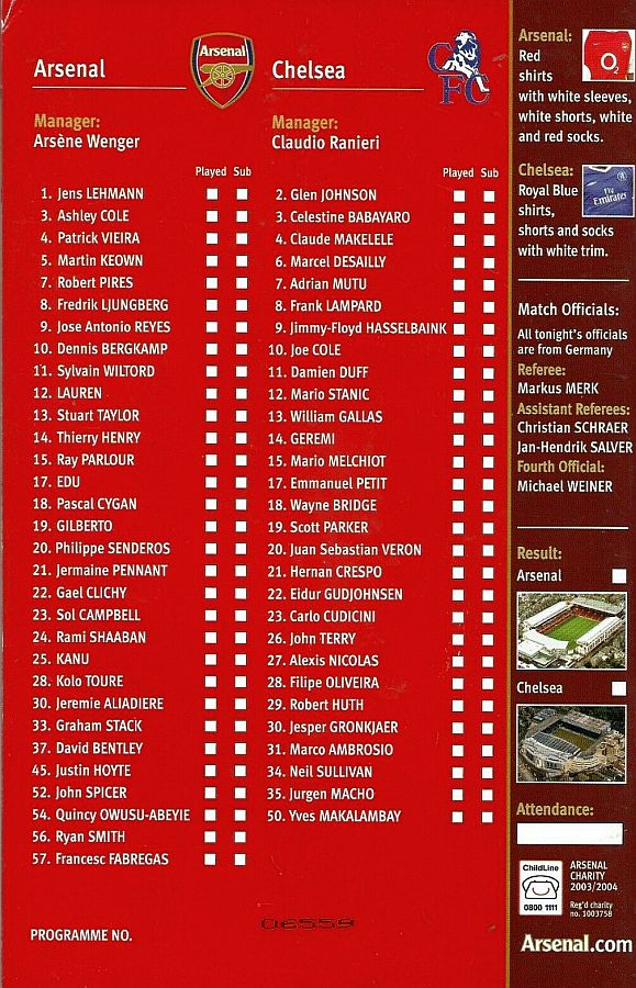 23 Carlo Cudicini, 2 Glen Johnson (12 Mario Stanic 82), 4 Claude Makelele, 8 Frank Lampard (27 Alexis Nicolas 90), 10 Joe Cole, 13 William Gallas, 15 Mario Melchiot, 18 Wayne Bridge, 22 Eidur Gudjohnsen, 26 John Terry (29 Robert Huth 85), 30 Jesper Gronkjaer |
