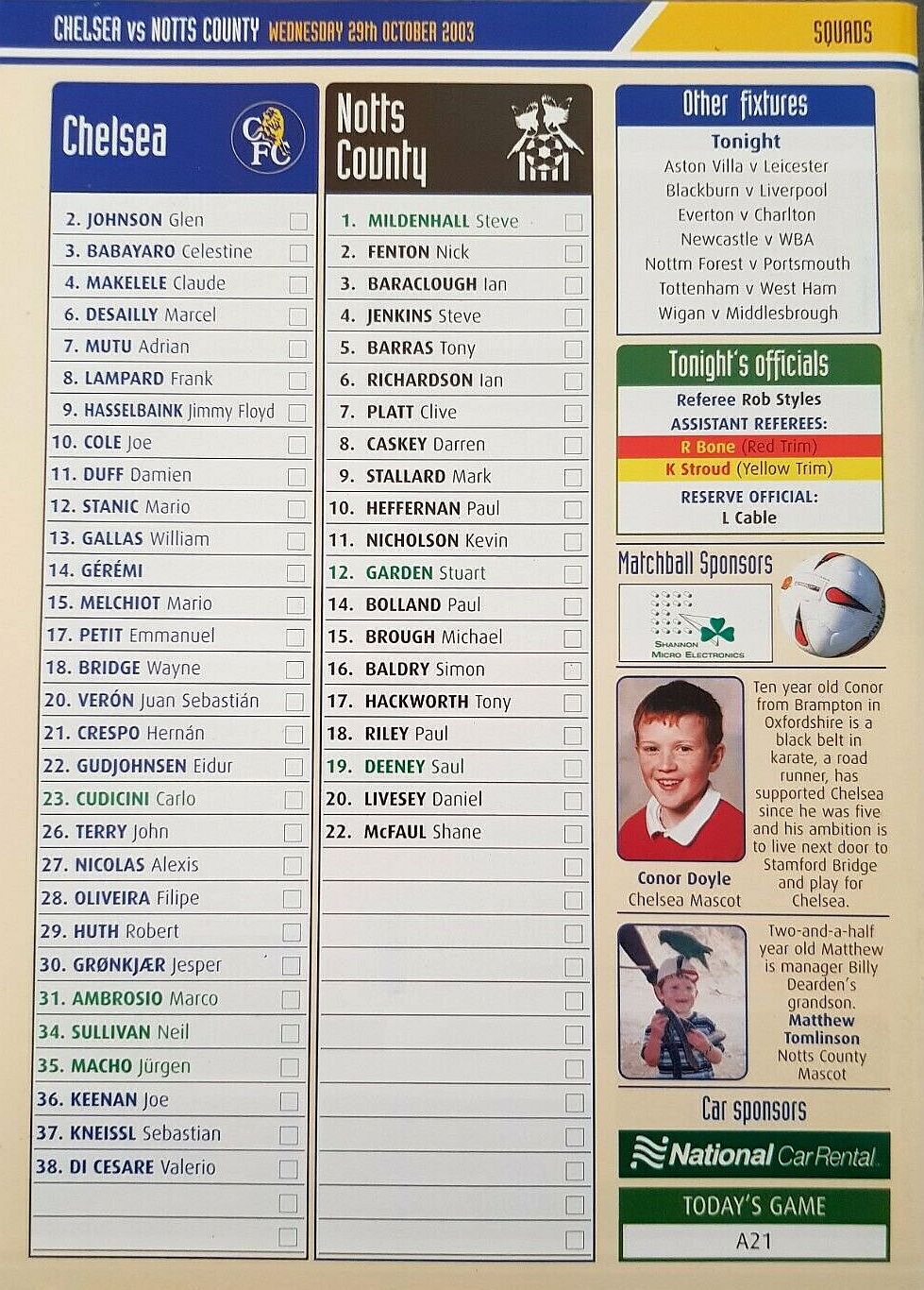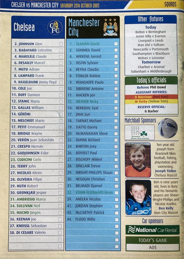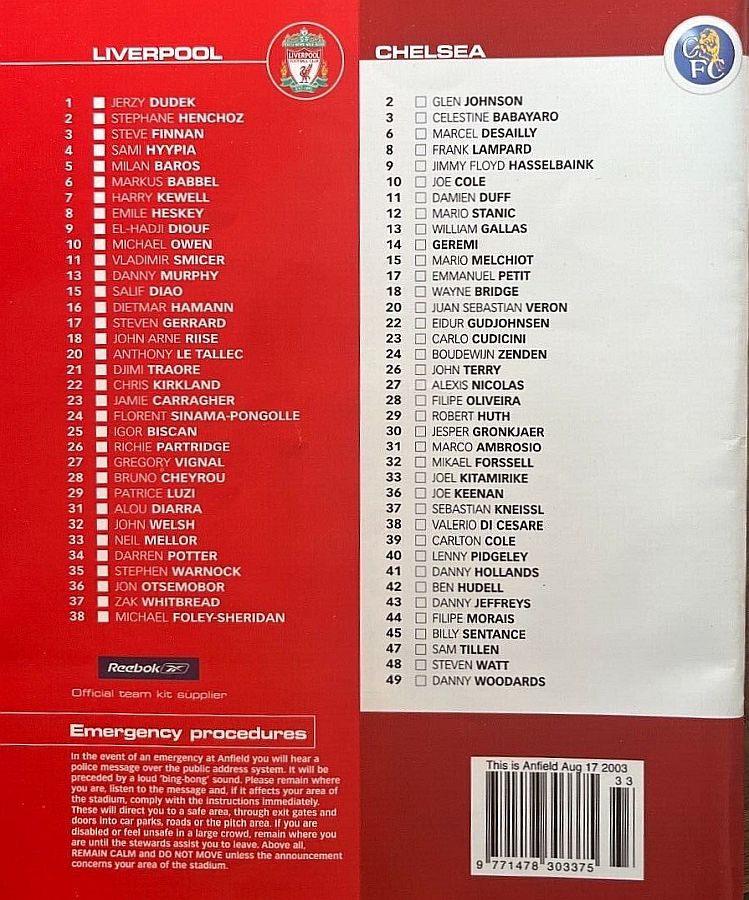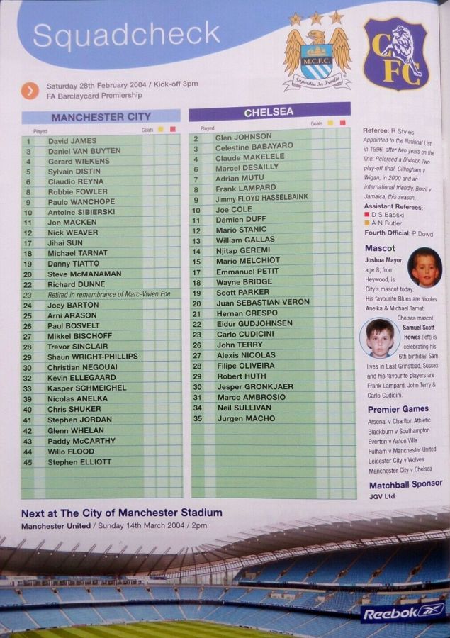 23 Carlo Cudicini, 2 Glen Johnson (12 Mario Stanic 82), 4 Claude Makelele, 8 Frank Lampard (27 Alexis Nicolas 90), 10 Joe Cole, 13 William Gallas, 15 Mario Melchiot, 18 Wayne Bridge, 22 Eidur Gudjohnsen, 26 John Terry (29 Robert Huth 85), 30 Jesper Gronkjaer |