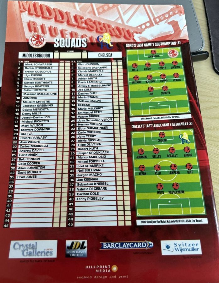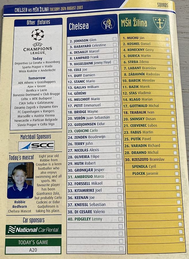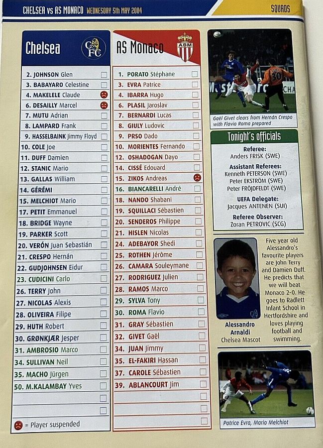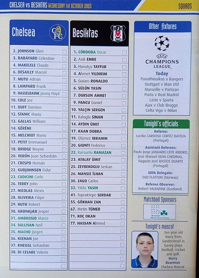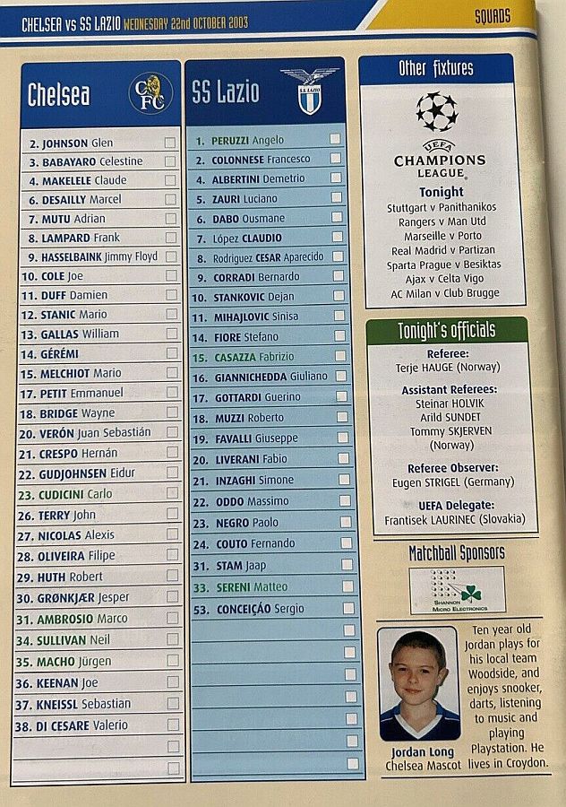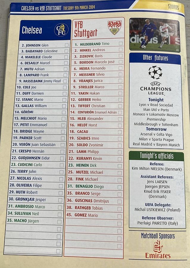 23 Carlo Cudicini, 2 Glen Johnson, 6 Marcel Desailly, 7 Adrian Mutu (21 Hernan Crespo 75), 8 Frank Lampard, 9 Jimmy Floyd Hasselbaink, 11 Damien Duff (17 Emmanuel Petit 45), 14 Geremi, 18 Wayne Bridge (10 Joe Cole 84), 20 Juan Veron, 26 John Terry |