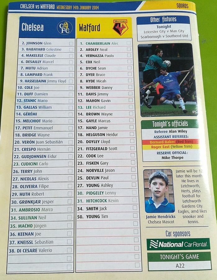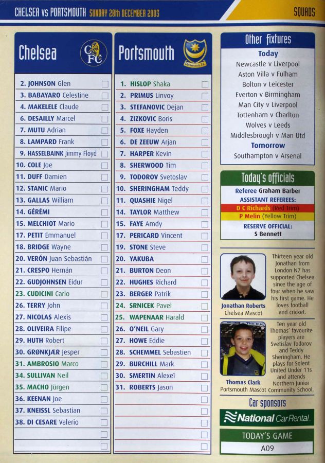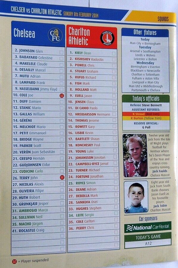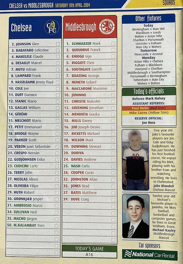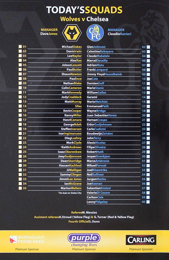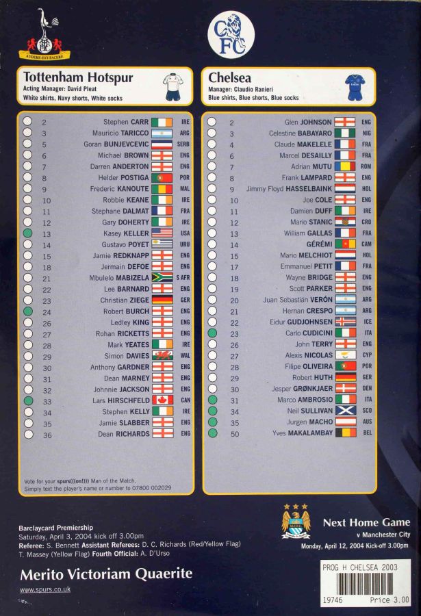 23 Carlo Cudicini, 4 Claude Makelele, 8 Frank Lampard, 10 Joe Cole (19 Scott Parker 78), 14 Geremi, 15 Mario Melchiot ( 2 Glen Johnson 74), 18 Wayne Bridge, 22 Eidur Gudjohnsen, 26 John Terry, 29 Robert Huth, 30 Jesper Gronkjaer ( 3 Celestine Babayaro 83) |