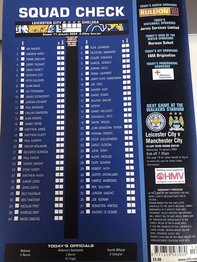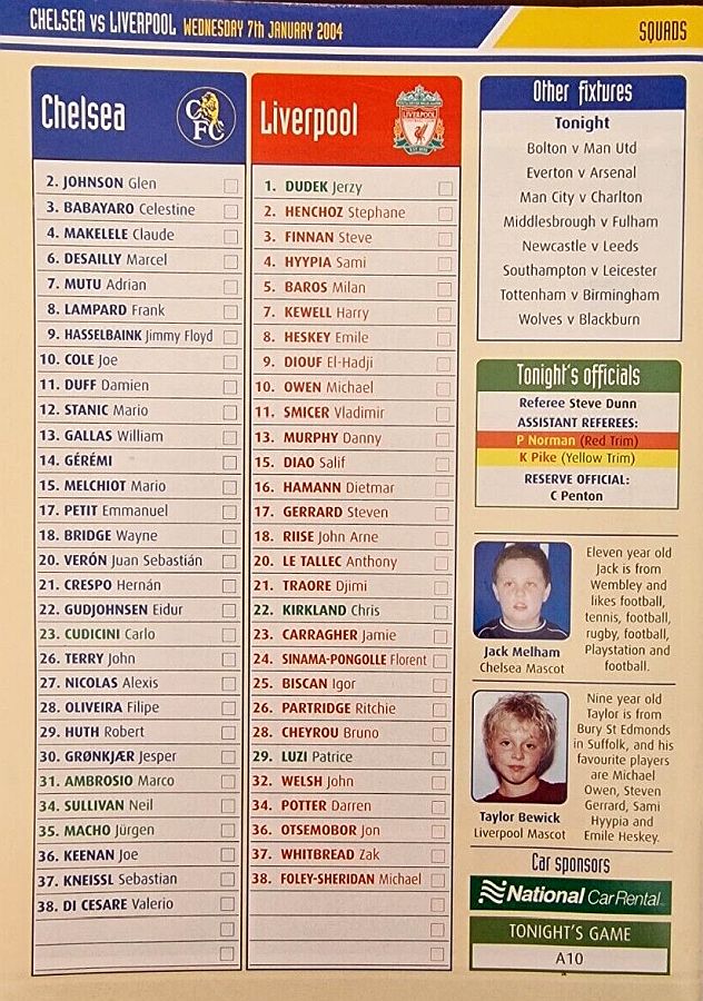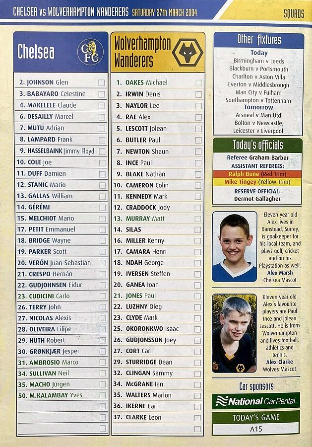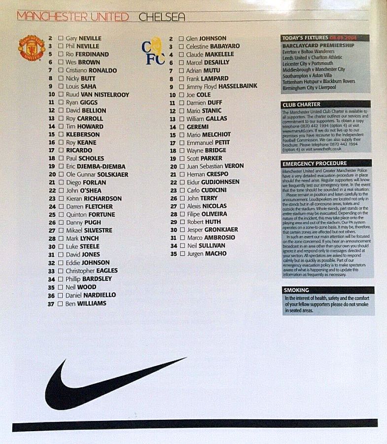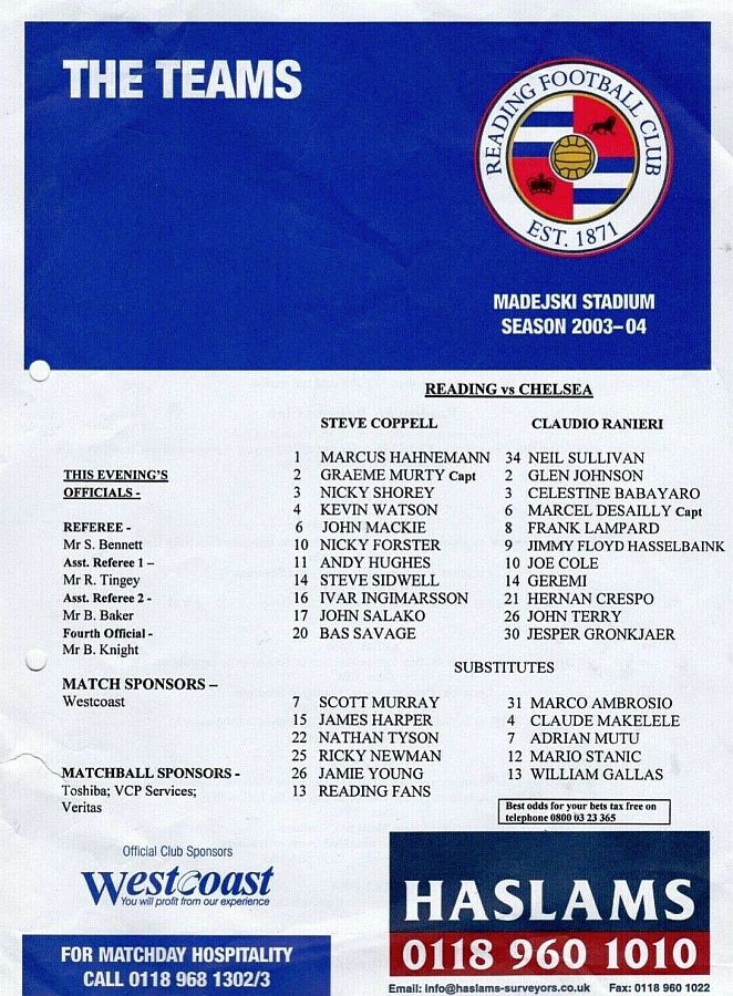 23 Carlo Cudicini, 4 Claude Makelele, 8 Frank Lampard, 10 Joe Cole (19 Scott Parker 78), 14 Geremi, 15 Mario Melchiot ( 2 Glen Johnson 74), 18 Wayne Bridge, 22 Eidur Gudjohnsen, 26 John Terry, 29 Robert Huth, 30 Jesper Gronkjaer ( 3 Celestine Babayaro 83) |