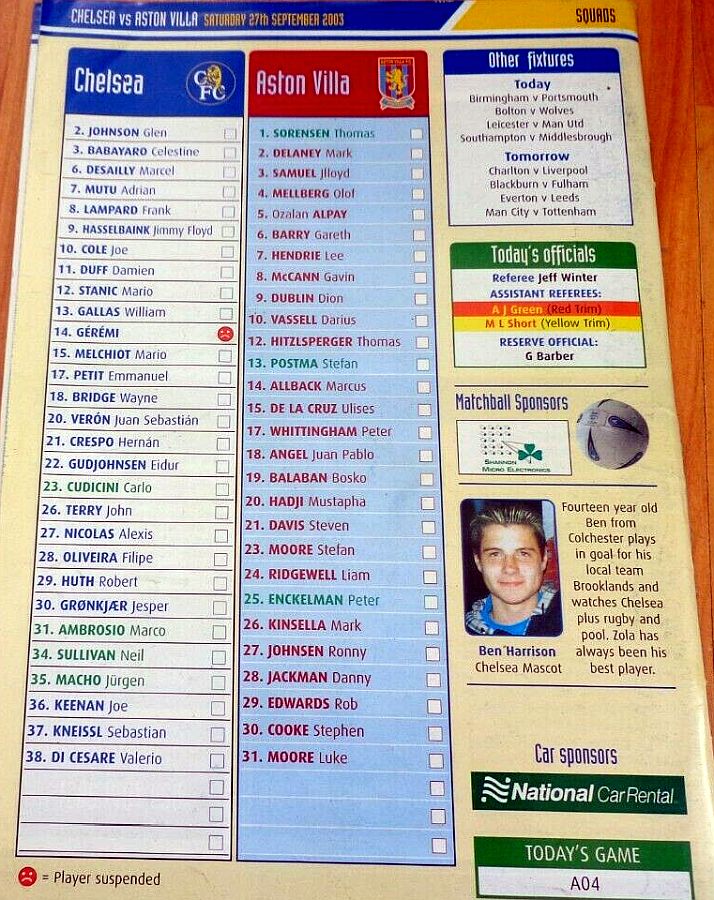 31 Marco Ambrosio, 4 Claude Makelele, 6 Marcel Desailly, 8 Frank Lampard, 15 Mario Melchiot ( 9 Jimmy Floyd Hasselbaink 62), 18 Wayne Bridge, 19 Scott Parker (29 Robert Huth 69), 21 Hernan Crespo, 22 Eidur Gudjohnsen, 26 John Terry, 30 Jesper Gronkjaer (20 Juan Veron 45) |