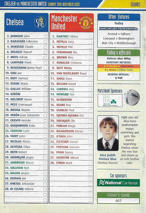 23 Carlo Cudicini, 6 Marcel Desailly, 7 Adrian Mutu (30 Jesper Gronkjaer 69), 8 Frank Lampard, 9 Jimmy Floyd Hasselbaink (22 Eidur Gudjohnsen 87), 11 Damien Duff (10 Joe Cole 82), 14 Geremi, 15 Mario Melchiot, 18 Wayne Bridge, 20 Juan Veron, 26 John Terry |