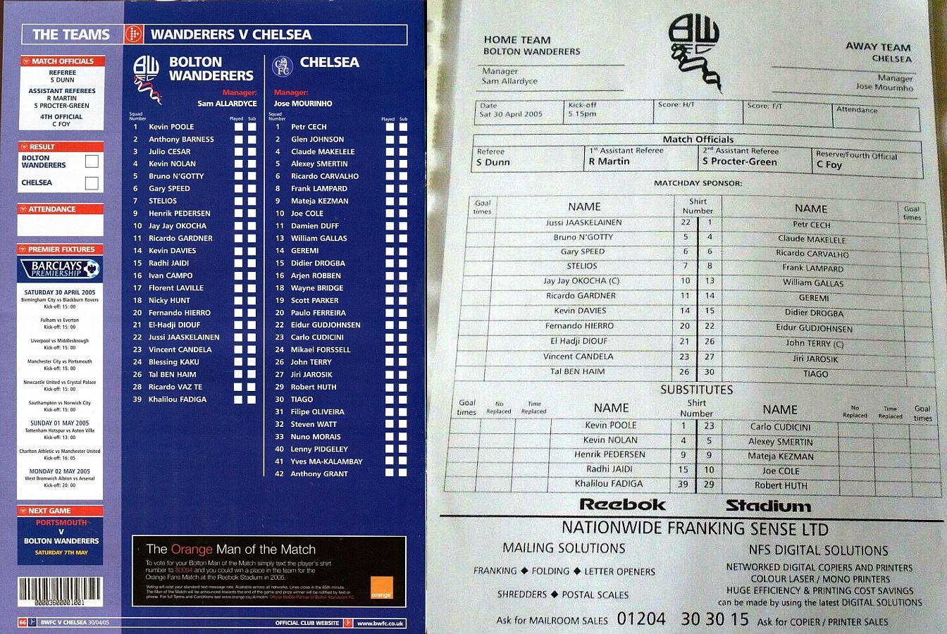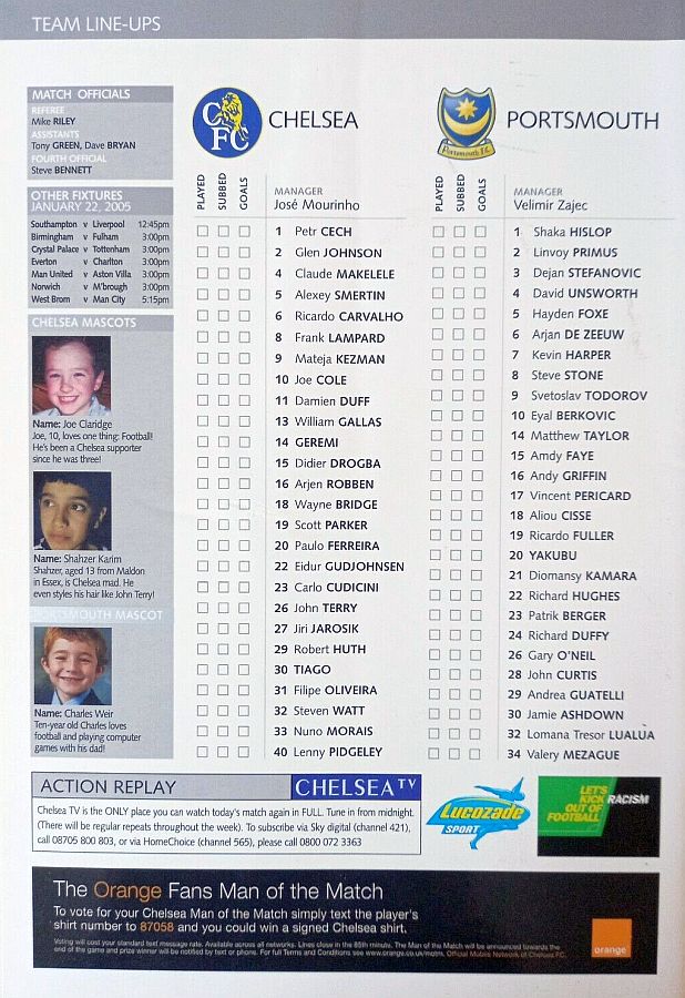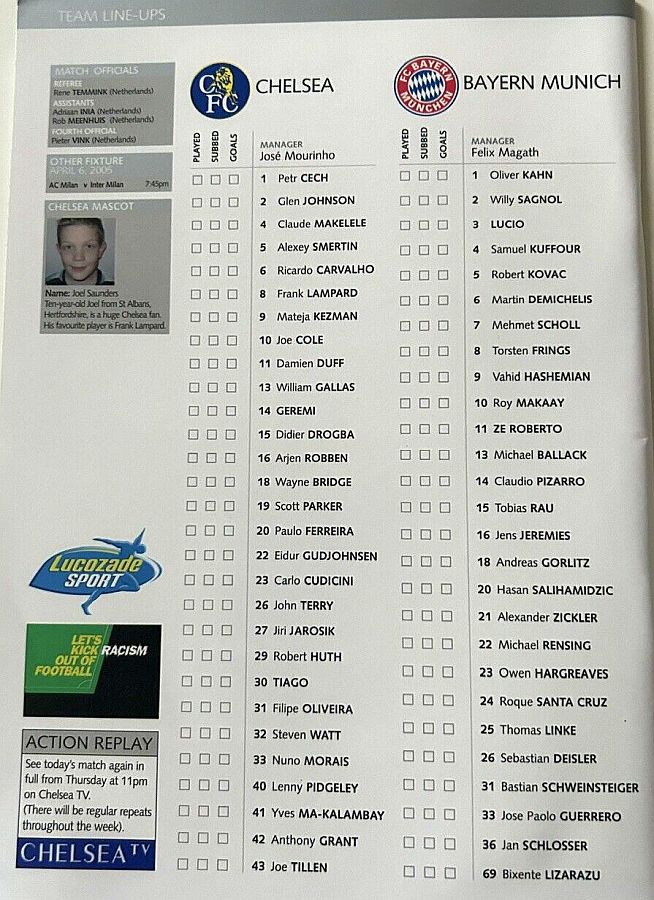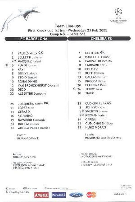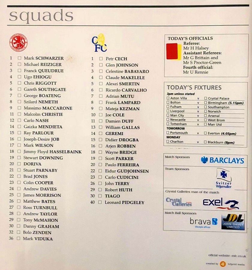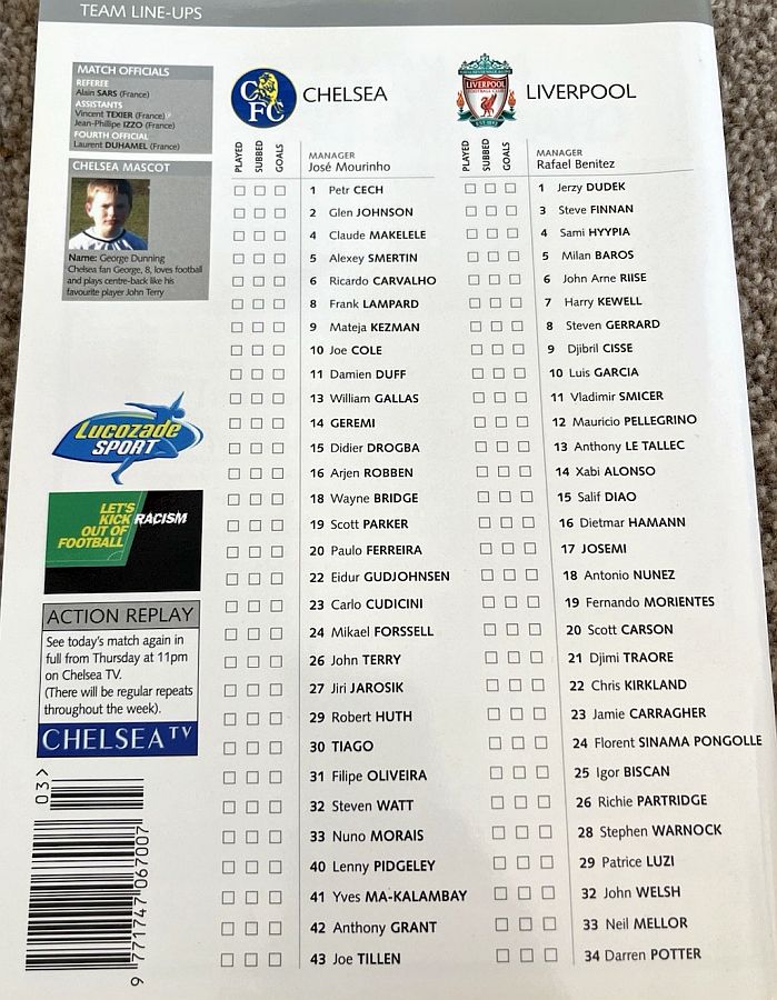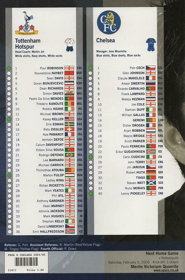 23 Carlo Cudicini, 2 Glen Johnson, 4 Claude Makelele, 6 Ricardo Carvalho, 8 Frank Lampard, 10 Joe Cole (33 Nuno Morais 89), 14 Geremi, 22 Eidur Gudjohnsen (31 Filipe Oliveira 84), 27 Jiri Jarosik (32 Steven Watt 90), 29 Robert Huth, 30 Tiago |