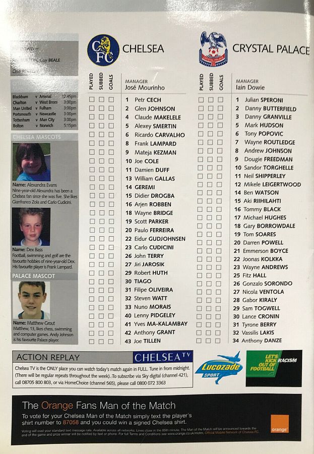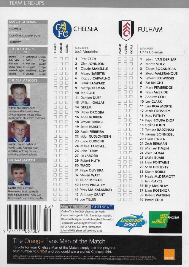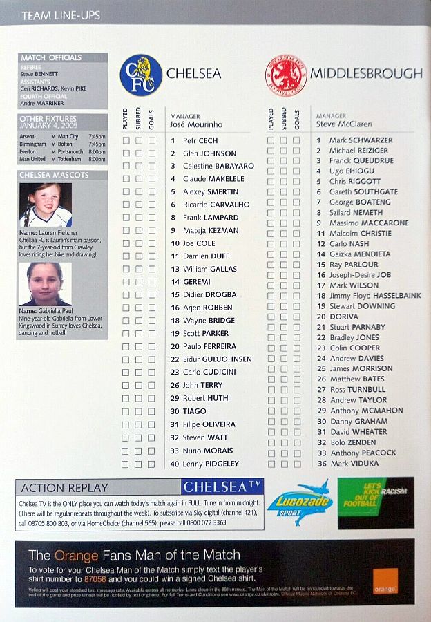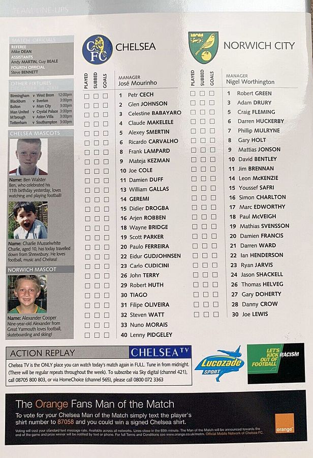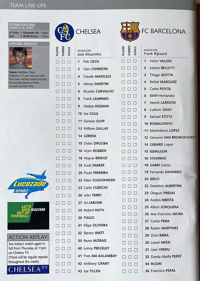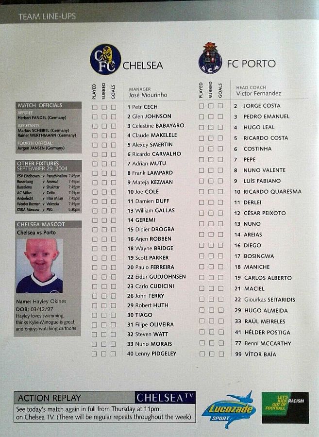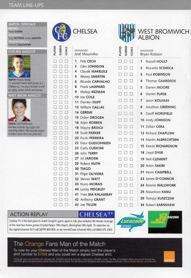 23 Carlo Cudicini, 2 Glen Johnson, 4 Claude Makelele, 6 Ricardo Carvalho, 8 Frank Lampard, 10 Joe Cole (33 Nuno Morais 89), 14 Geremi, 22 Eidur Gudjohnsen (31 Filipe Oliveira 84), 27 Jiri Jarosik (32 Steven Watt 90), 29 Robert Huth, 30 Tiago |