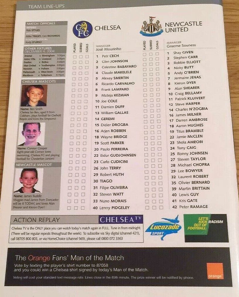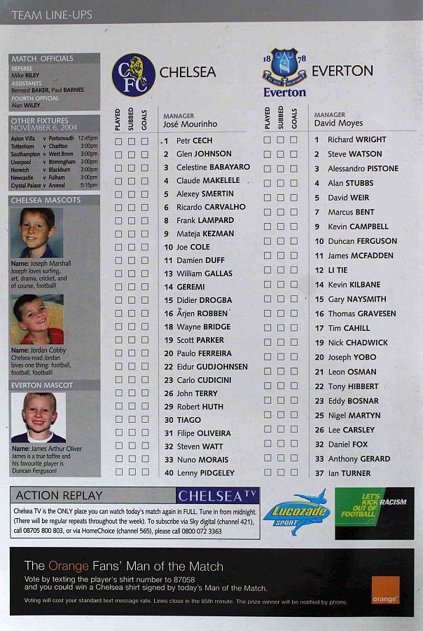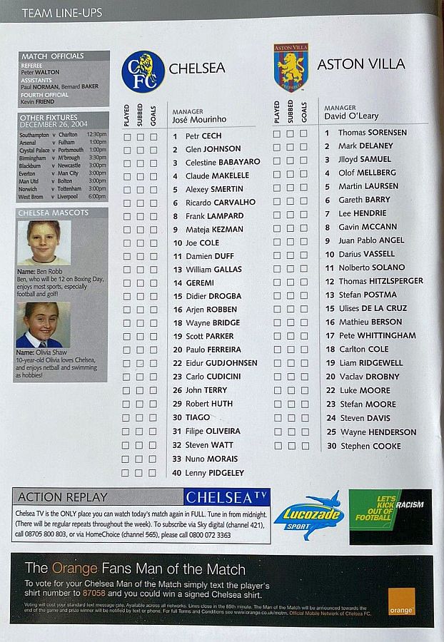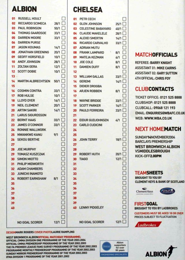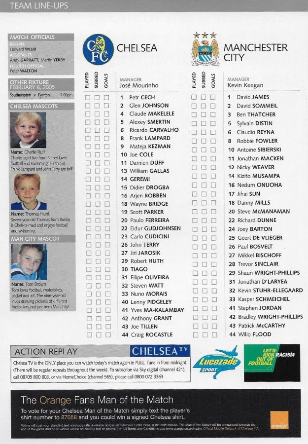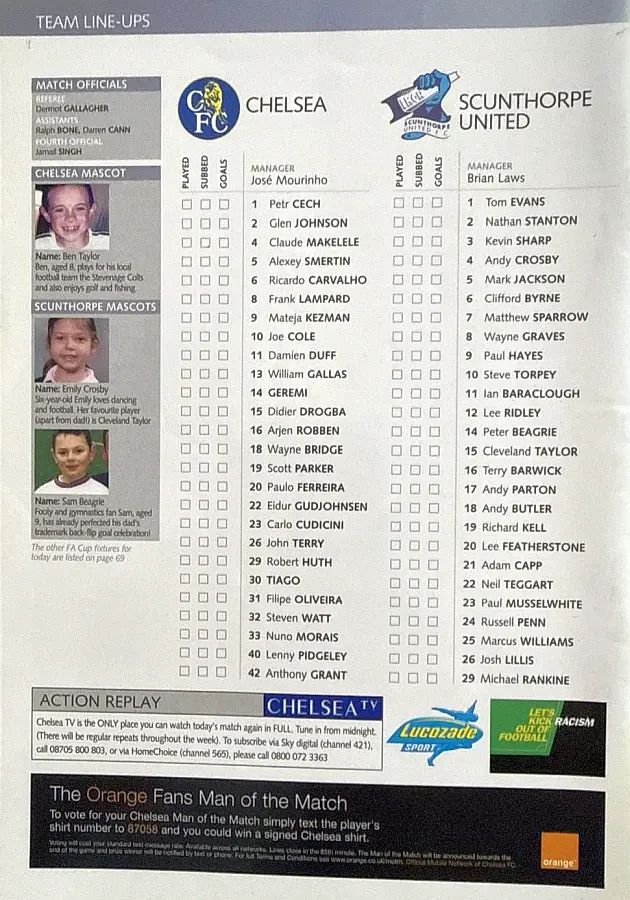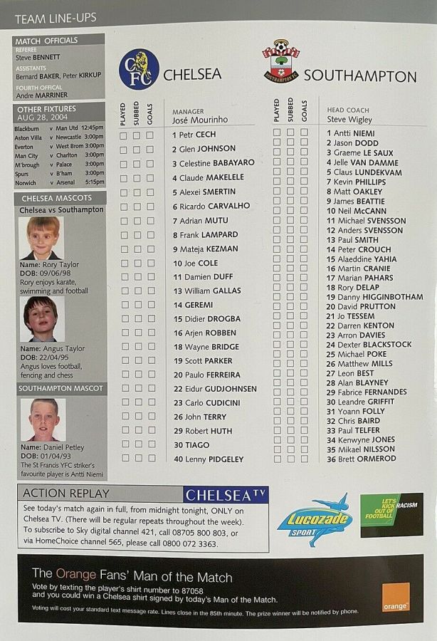 23 Carlo Cudicini, 2 Glen Johnson, 4 Claude Makelele, 6 Ricardo Carvalho, 8 Frank Lampard, 10 Joe Cole (33 Nuno Morais 89), 14 Geremi, 22 Eidur Gudjohnsen (31 Filipe Oliveira 84), 27 Jiri Jarosik (32 Steven Watt 90), 29 Robert Huth, 30 Tiago |