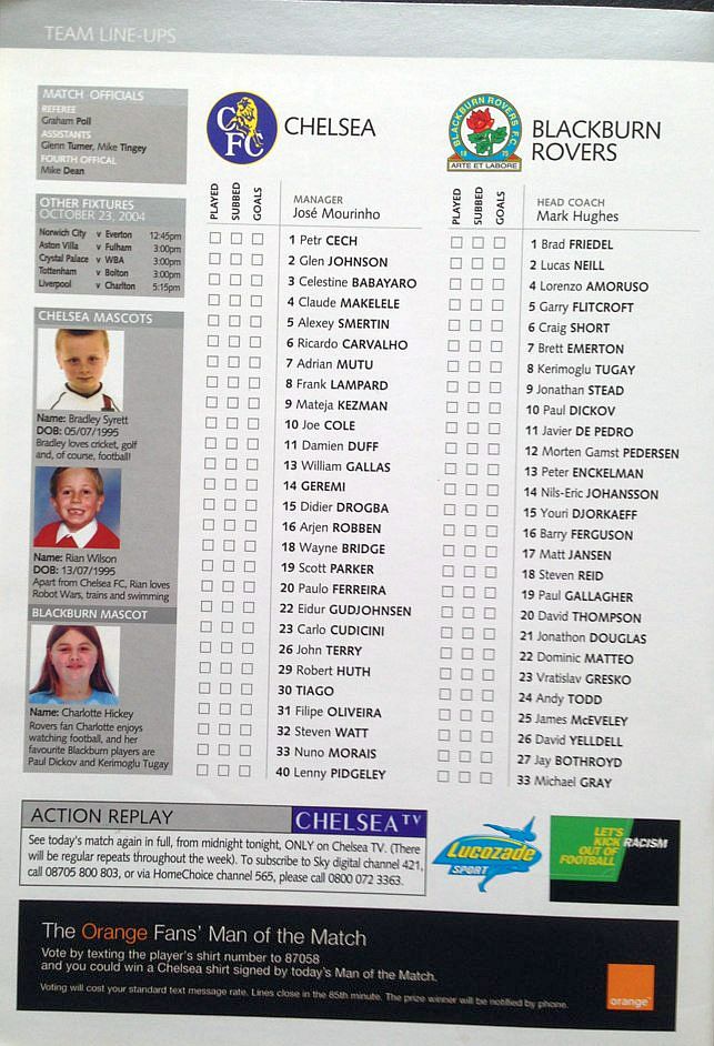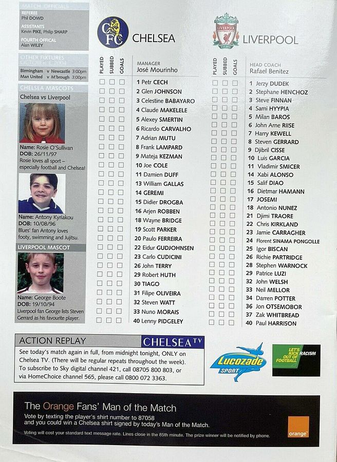 1 Petr Cech, 3 Celestine Babayaro, 4 Claude Makelele, 8 Frank Lampard, 9 Mateja Kezman ( 7 Adrian Mutu 70), 10 Joe Cole (14 Geremi 76), 13 William Gallas, 15 Didier Drogba (22 Eidur Gudjohnsen 75), 20 Paulo Ferreira, 26 John Terry, 30 Tiago |