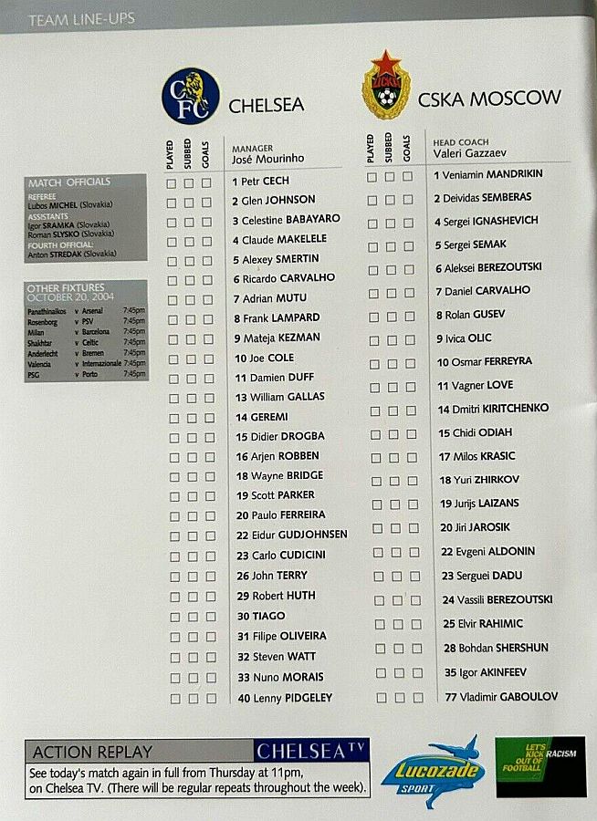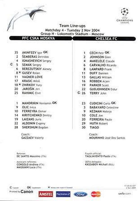 1 Petr Cech, 3 Celestine Babayaro, 4 Claude Makelele, 6 Ricardo Carvalho, 8 Frank Lampard, 9 Mateja Kezman (22 Eidur Gudjohnsen 61), 10 Joe Cole ( 7 Adrian Mutu 61), 15 Didier Drogba, 20 Paulo Ferreira, 26 John Terry, 30 Tiago ( 5 Alexey Smertin 66) |