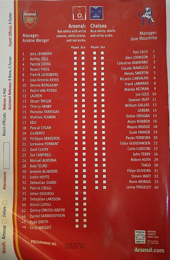 Jens Lehmann, Ashley Cole, Kolo Toure, Philippe Senderos, Lauren, Gilberto Silva, Cesc Fabregas (Jeremie Aliadiere 81), Patrick Vieira, Robert Pires, Dennis Bergkamp (Robin van Persie 78), Jose Antonio Reyes |
