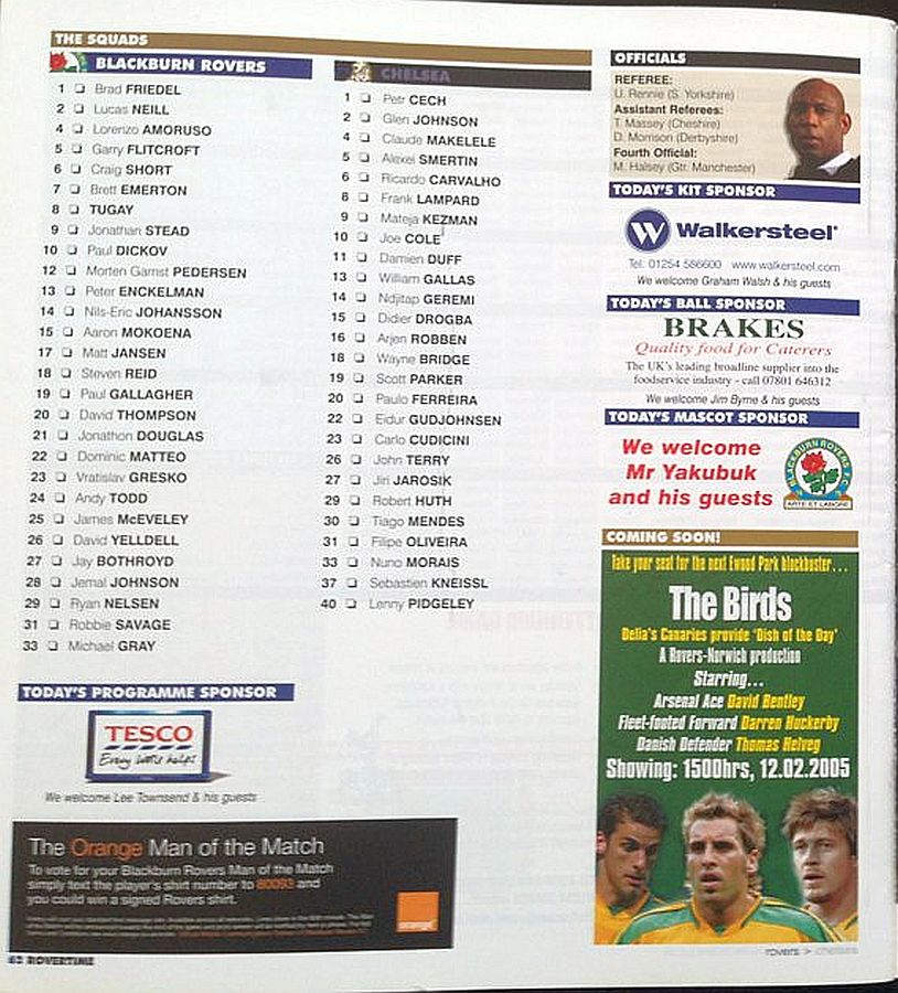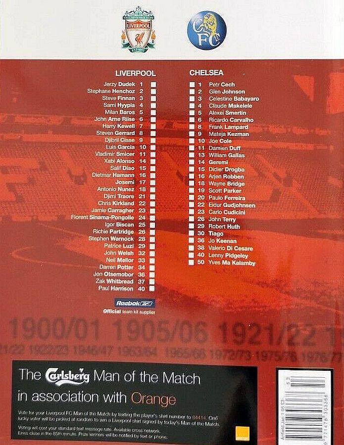 1 Petr Cech, 4 Claude Makelele, 5 Alexey Smertin (30 Tiago 45), 6 Ricardo Carvalho, 8 Frank Lampard, 14 Geremi (10 Joe Cole 63), 15 Didier Drogba, 18 Wayne Bridge, 20 Paulo Ferreira, 22 Eidur Gudjohnsen ( 9 Mateja Kezman 45), 26 John Terry |
