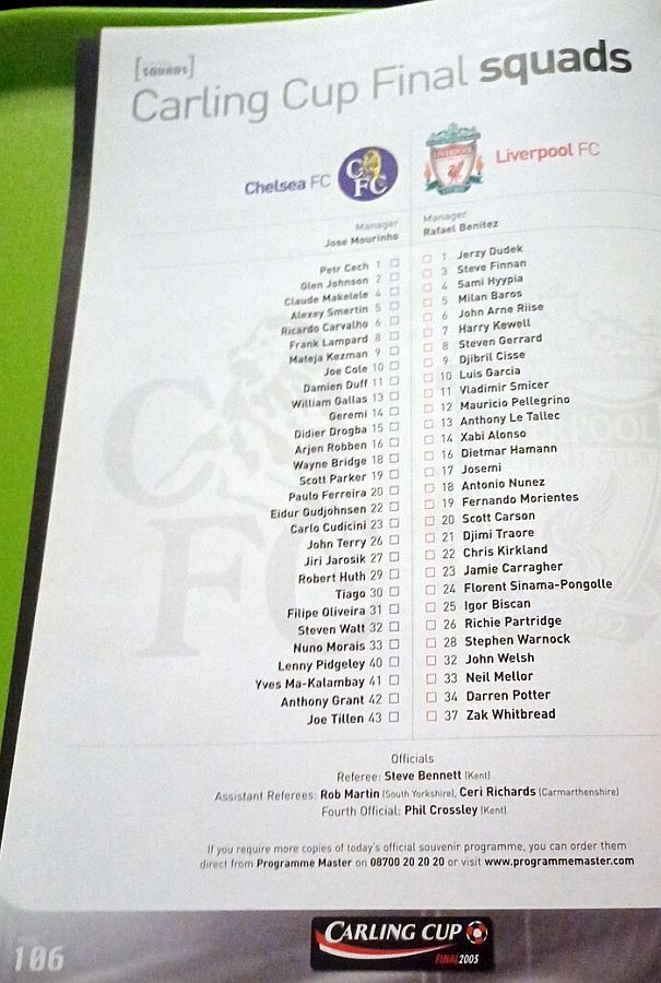 23 Carlo Cudicini (40 Lenny Pidgeley 82), 2 Glen Johnson (27 Jiri Jarosik 67), 4 Claude Makelele, 6 Ricardo Carvalho, 8 Frank Lampard, 10 Joe Cole, 13 William Gallas, 14 Geremi, 22 Eidur Gudjohnsen, 26 John Terry, 30 Tiago (24 Mikael Forssell 67) |
