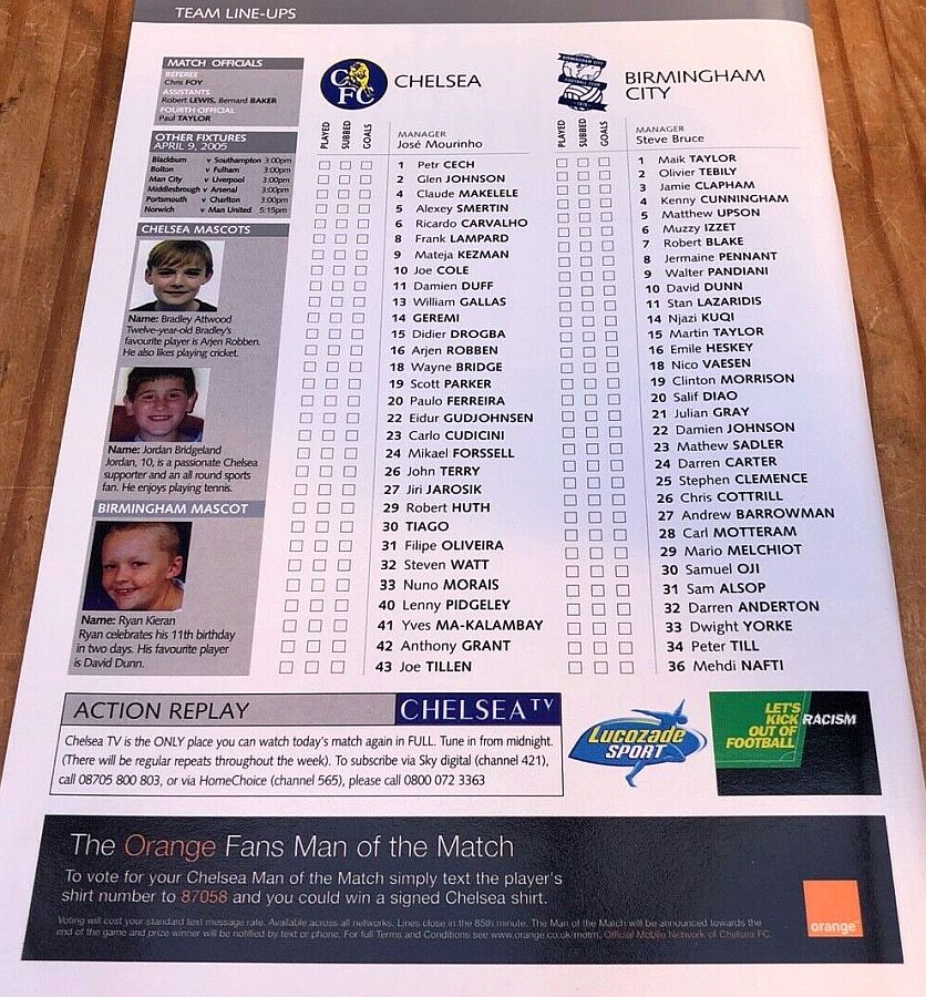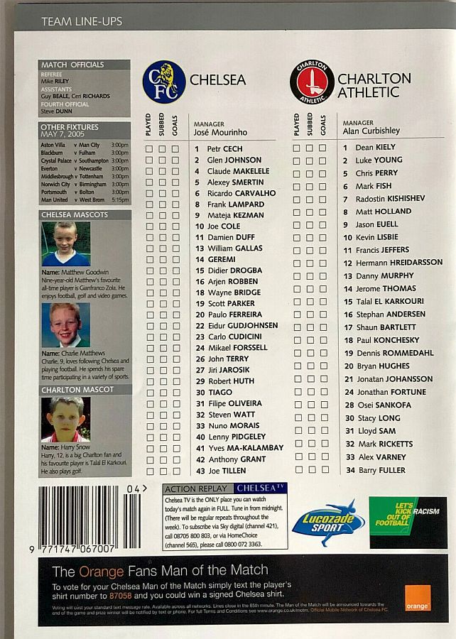 1 Petr Cech, 4 Claude Makelele (14 Geremi 90), 6 Ricardo Carvalho, 8 Frank Lampard, 10 Joe Cole (11 Damien Duff 57), 15 Didier Drogba, 18 Wayne Bridge, 20 Paulo Ferreira, 22 Eidur Gudjohnsen ( 9 Mateja Kezman 60), 26 John Terry, 30 Tiago |