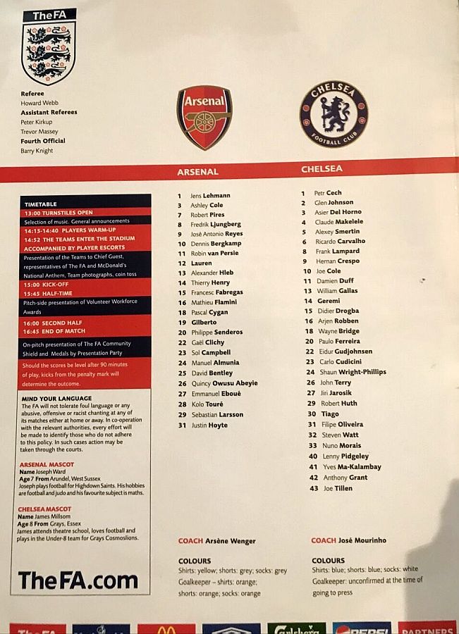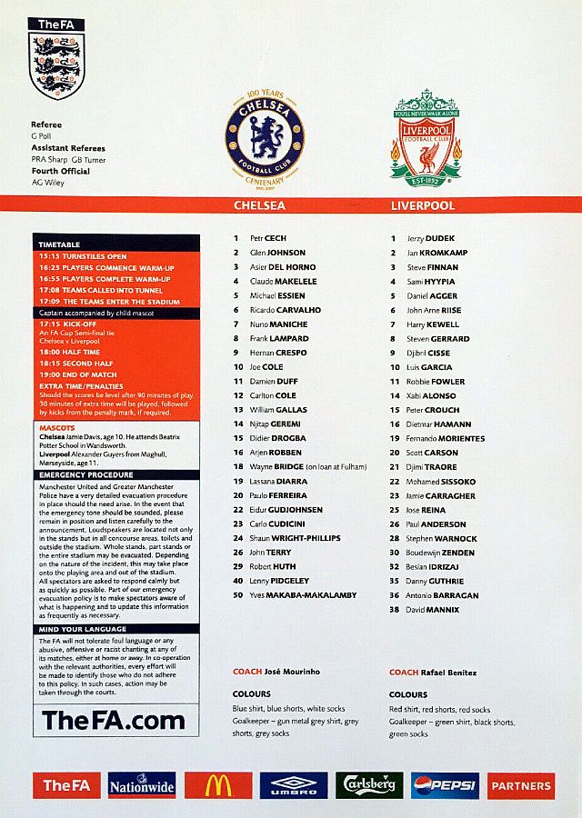 1 Petr Cech (23 Carlo Cudicini 45), 3 Asier Del Horno, 4 Claude Makelele, 5 Michael Essien, 8 Frank Lampard, 9 Hernan Crespo (24 Shaun Wright-Phillips 75), 13 William Gallas, 14 Geremi, 15 Didier Drogba, 16 Arjen Robben (10 Joe Cole 62), 26 John Terry |