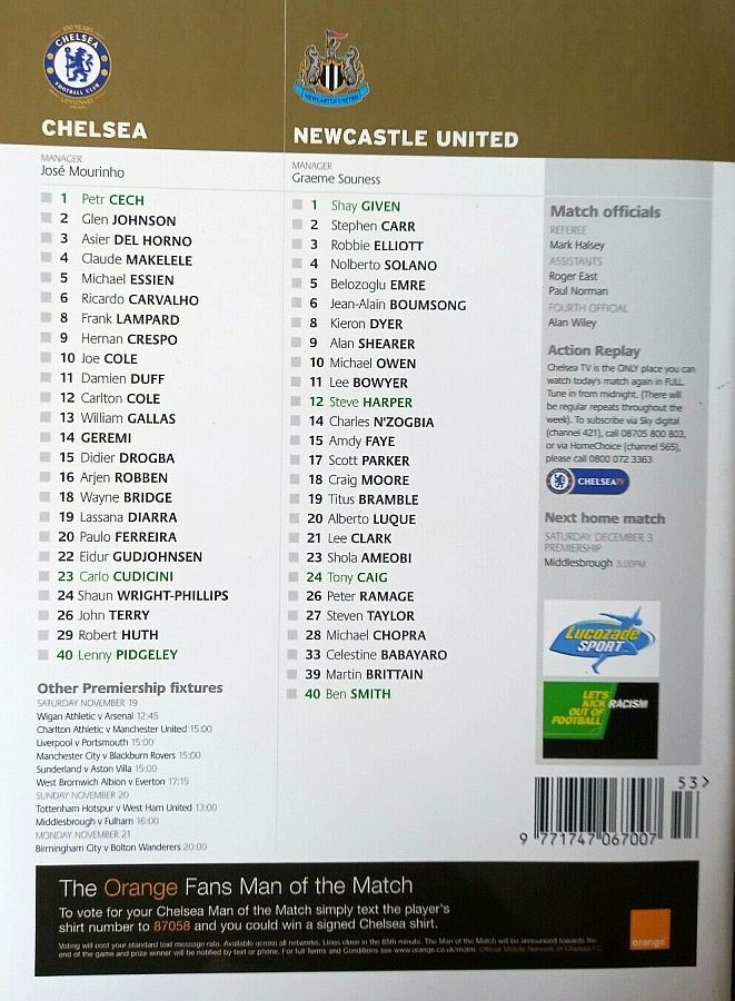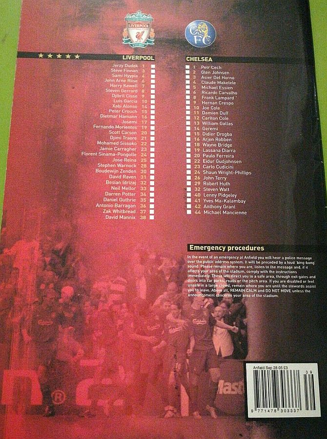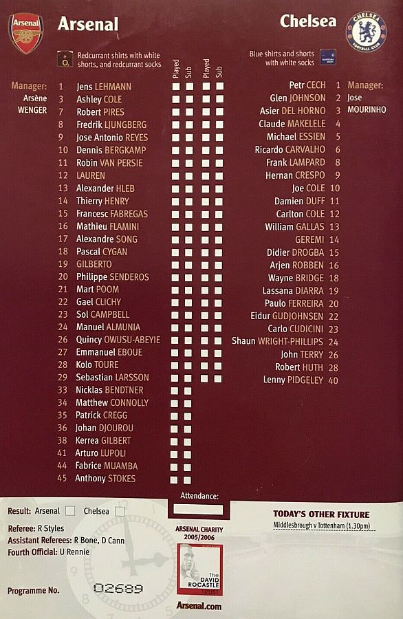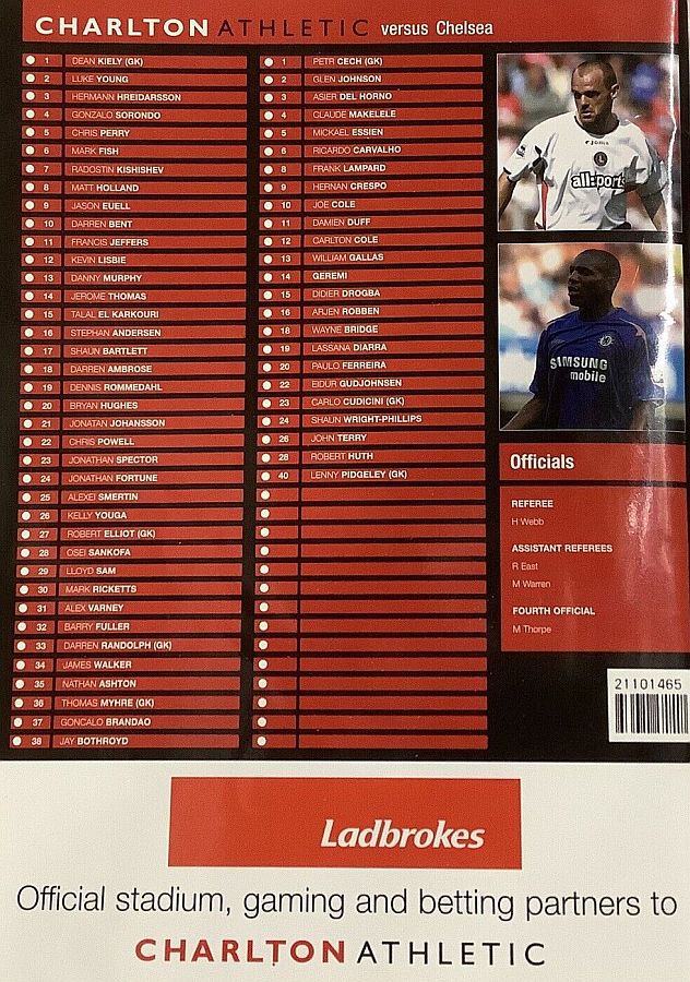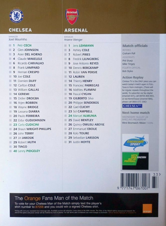 1 Petr Cech, 3 Asier Del Horno, 4 Claude Makelele, 8 Frank Lampard, 9 Hernan Crespo (15 Didier Drogba 45), 11 Damien Duff, 13 William Gallas, 16 Arjen Robben (24 Shaun Wright-Phillips 58), 20 Paulo Ferreira, 22 Eidur Gudjohnsen ( 5 Michael Essien 58), 26 John Terry |