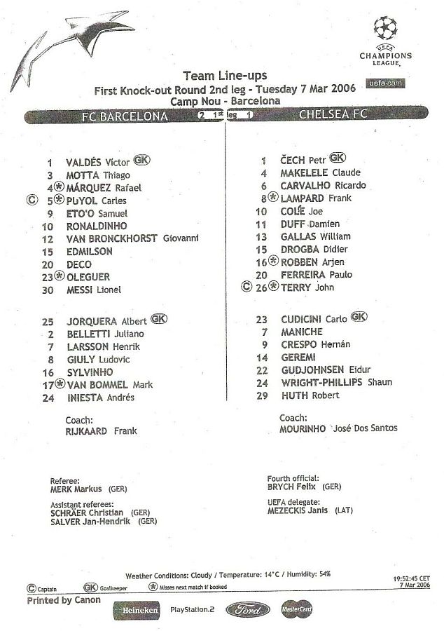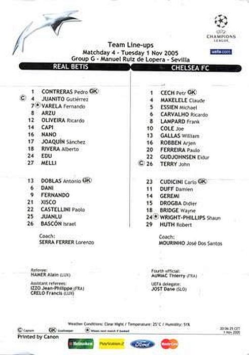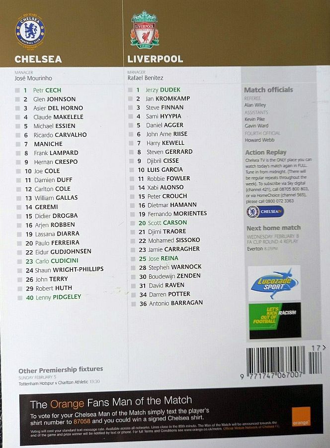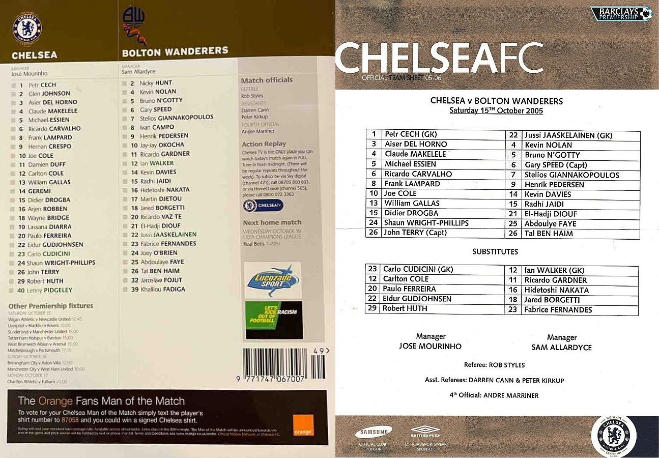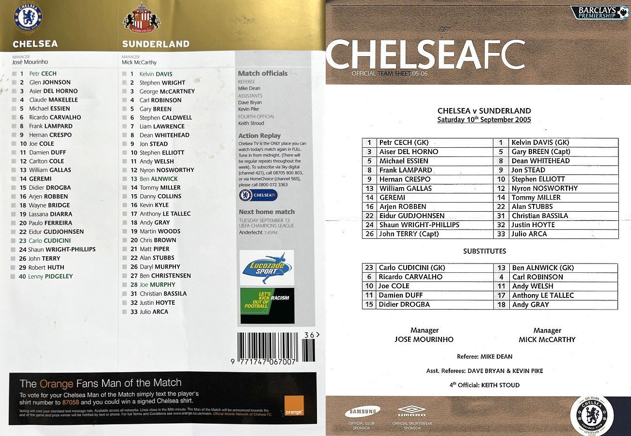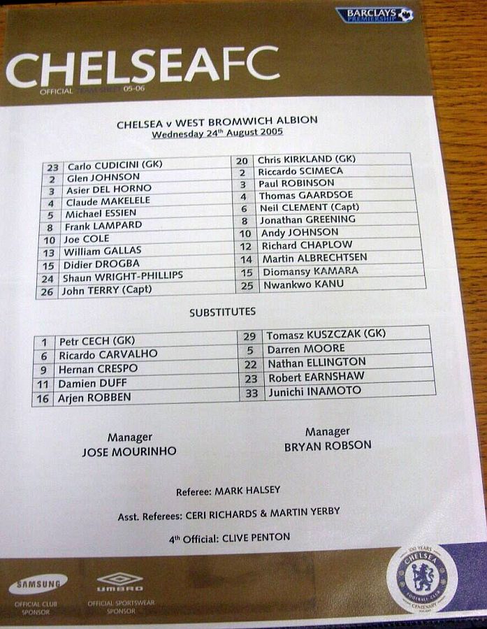 23 Carlo Cudicini, 3 Asier Del Horno (11 Damien Duff 45), 6 Ricardo Carvalho, 7 Maniche, 8 Frank Lampard, 9 Hernan Crespo, 13 William Gallas, 14 Geremi (12 Carlton Cole 77), 19 Lassana Diarra, 22 Eidur Gudjohnsen, 24 Shaun Wright-Phillips (10 Joe Cole 64) |