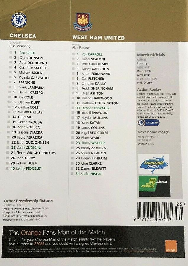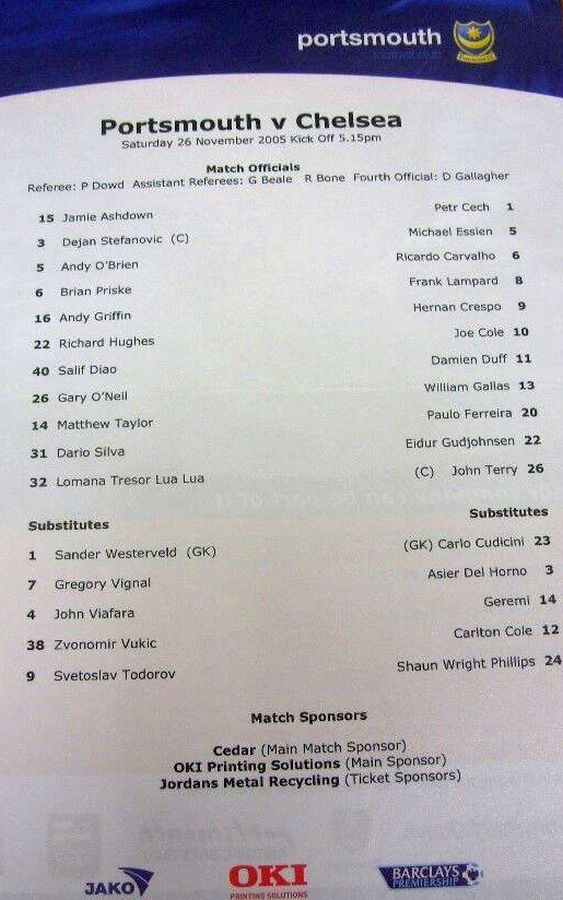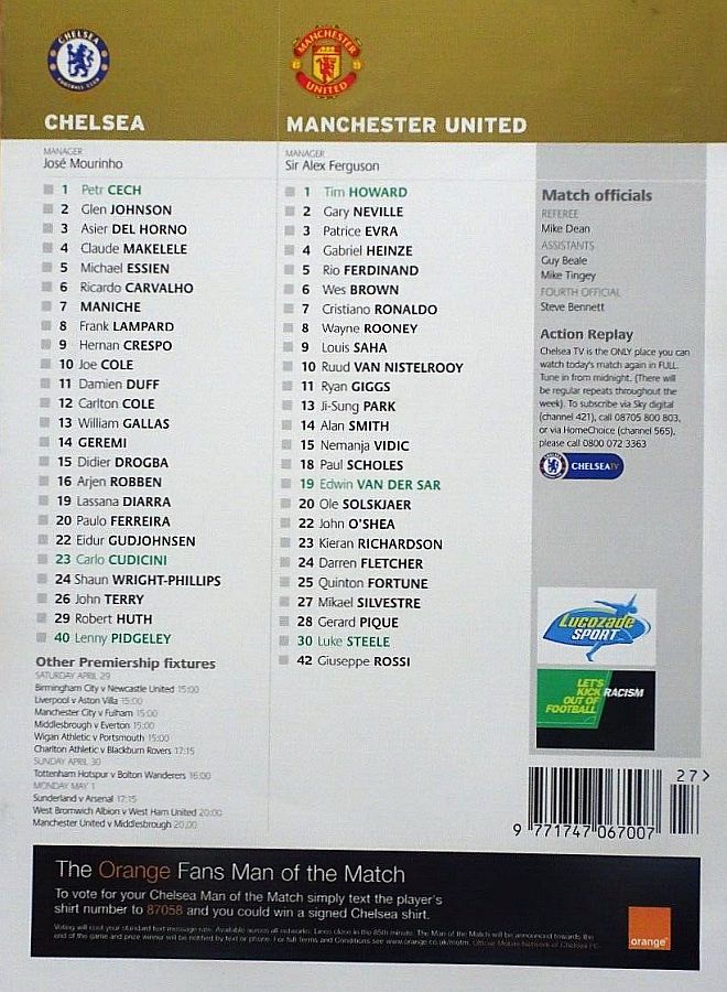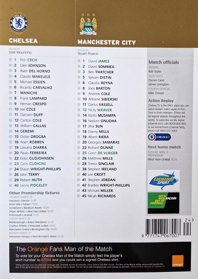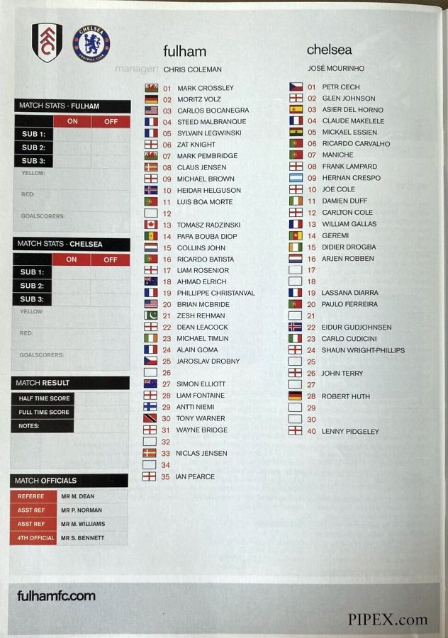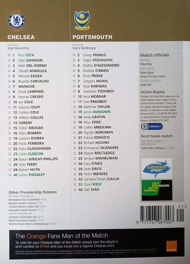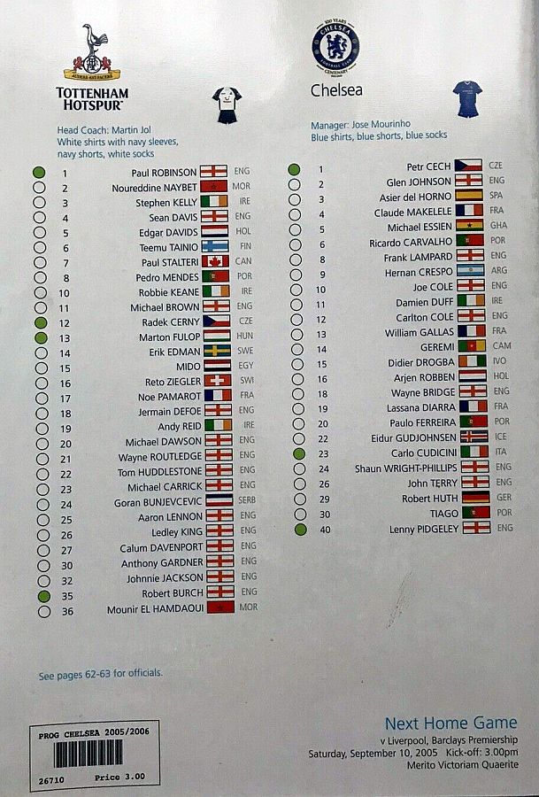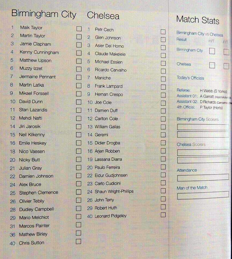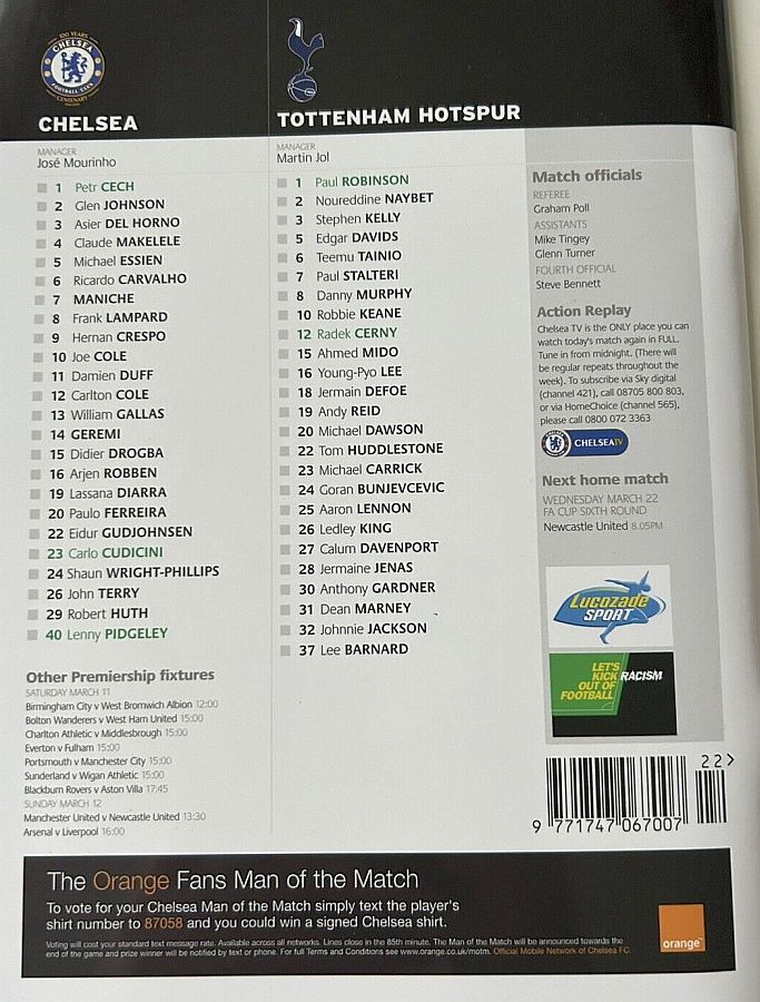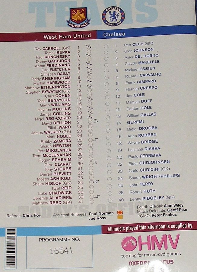 40 Lenny Pidgeley, 2 Glen Johnson, 6 Ricardo Carvalho (46 James Smith 81), 7 Maniche, 10 Joe Cole, 11 Damien Duff (12 Carlton Cole 46), 13 William Gallas, 16 Arjen Robben, 19 Lassana Diarra, 20 Paulo Ferreira, 29 Robert Huth (24 Shaun Wright-Phillips 46) |
