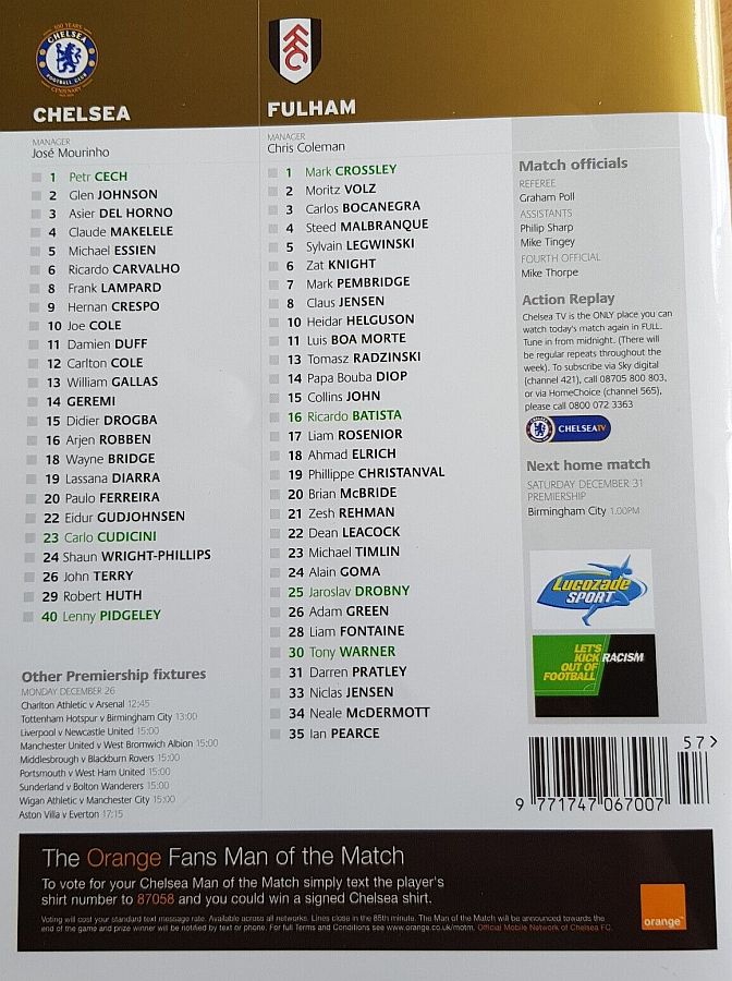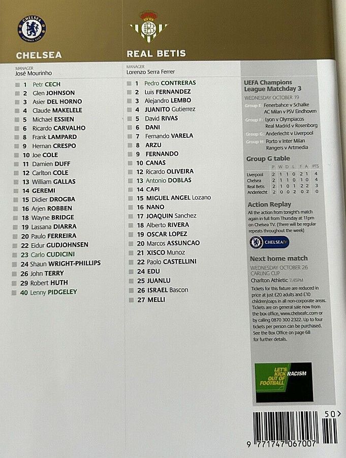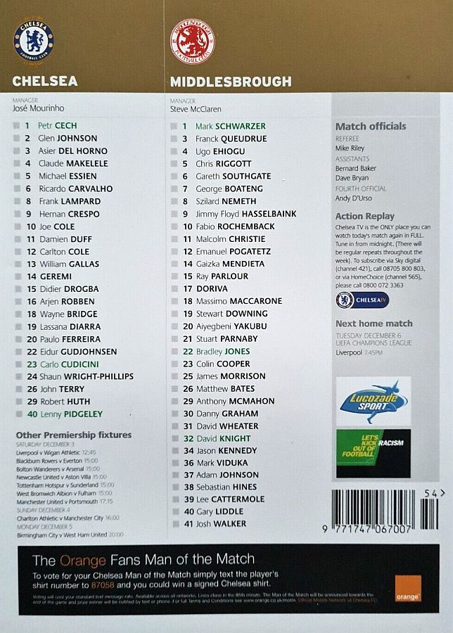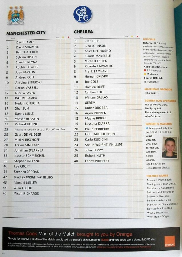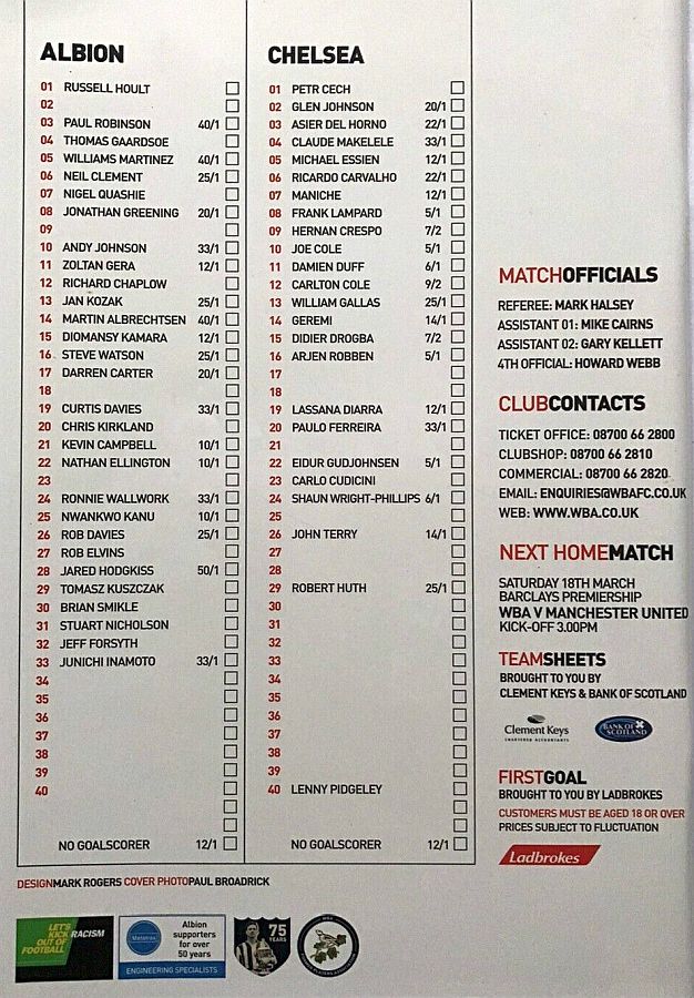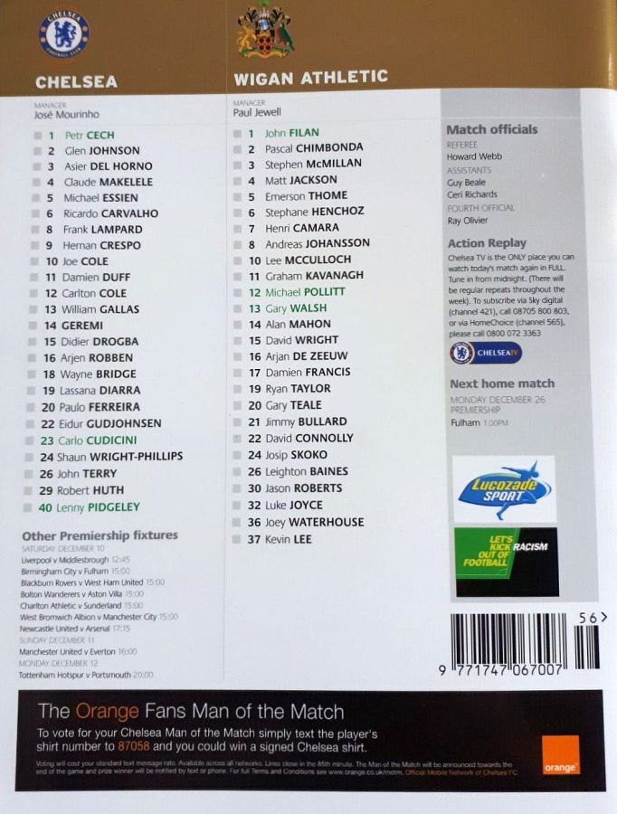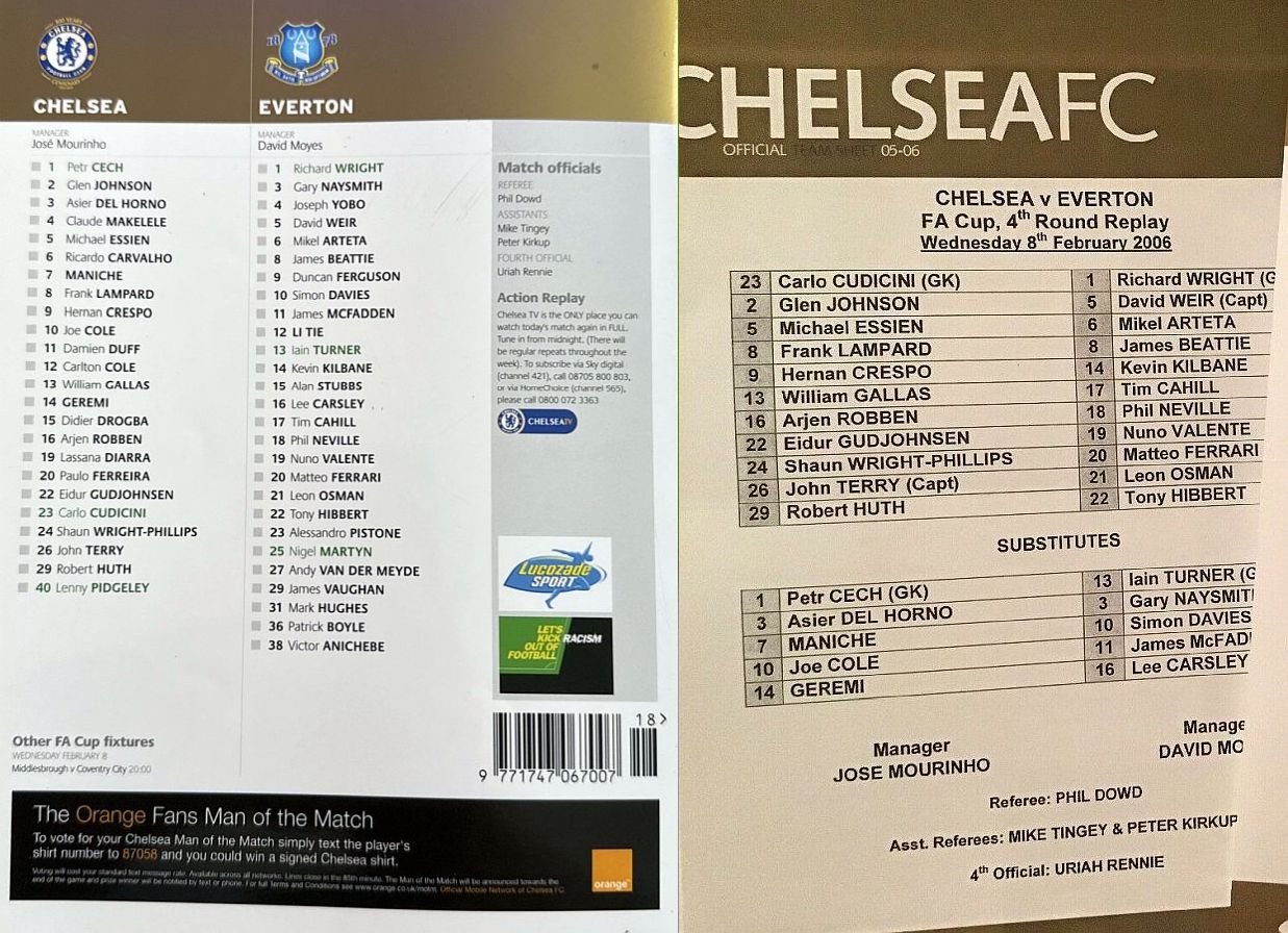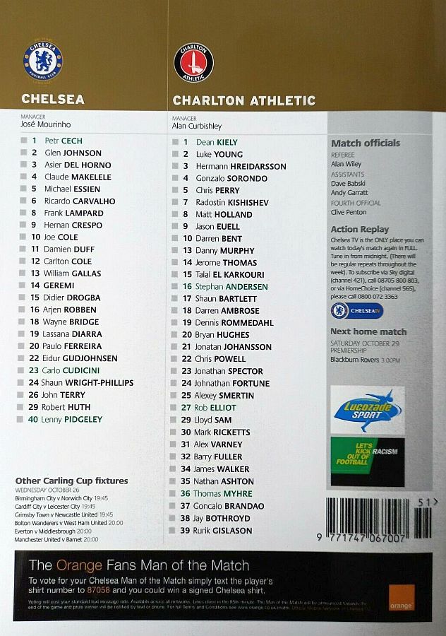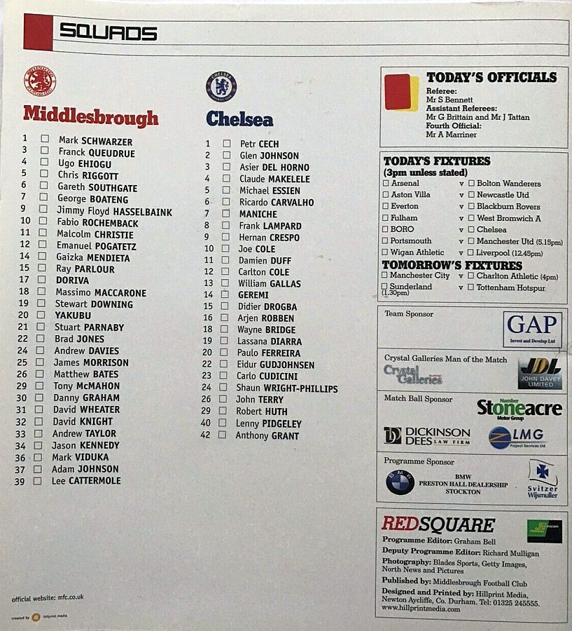 40 Lenny Pidgeley, 2 Glen Johnson, 6 Ricardo Carvalho (46 James Smith 81), 7 Maniche, 10 Joe Cole, 11 Damien Duff (12 Carlton Cole 46), 13 William Gallas, 16 Arjen Robben, 19 Lassana Diarra, 20 Paulo Ferreira, 29 Robert Huth (24 Shaun Wright-Phillips 46) |