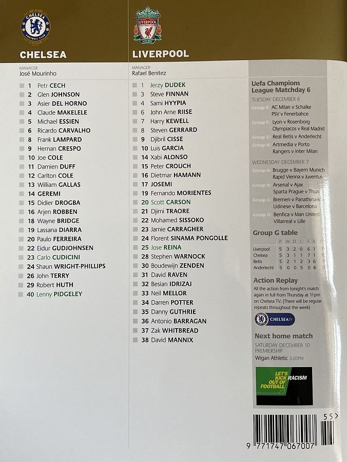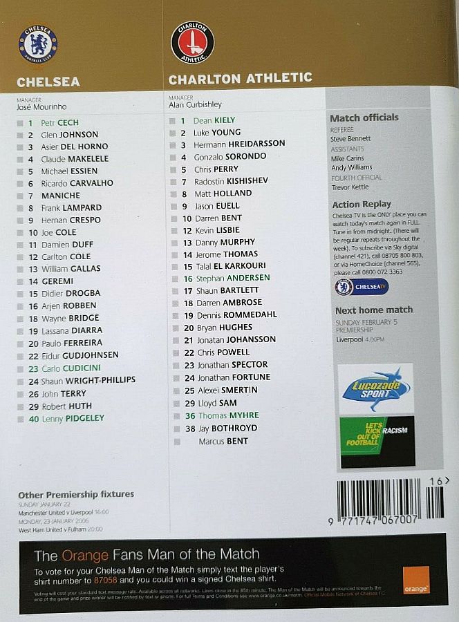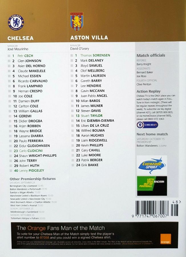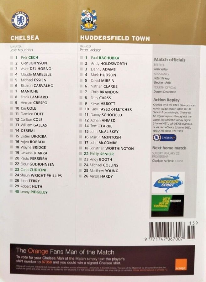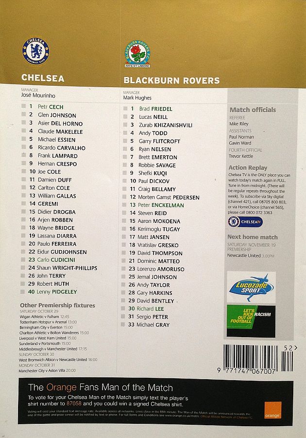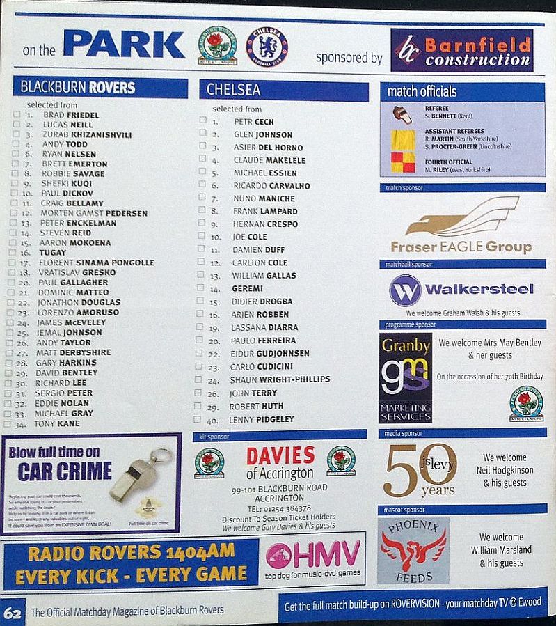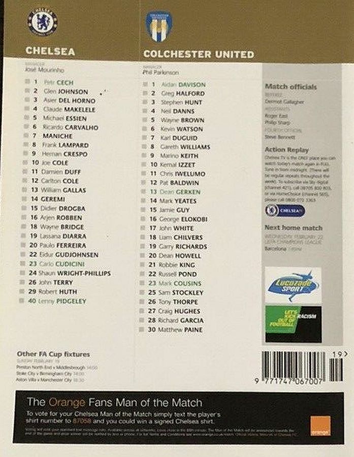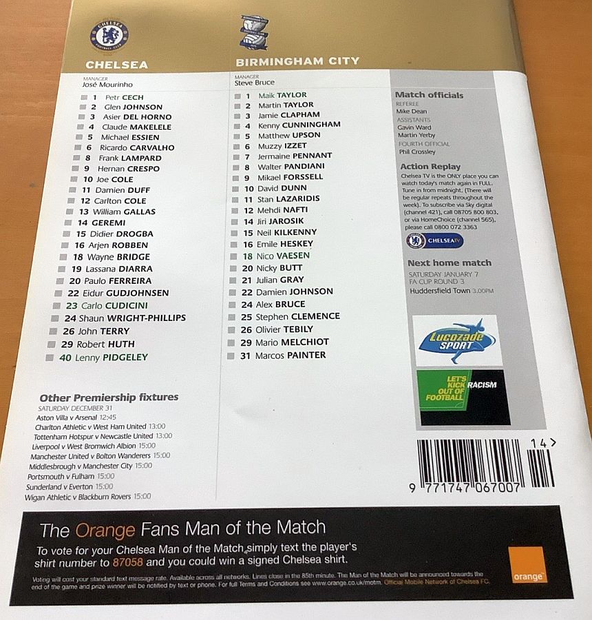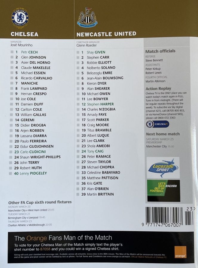 40 Lenny Pidgeley, 2 Glen Johnson, 6 Ricardo Carvalho (46 James Smith 81), 7 Maniche, 10 Joe Cole, 11 Damien Duff (12 Carlton Cole 46), 13 William Gallas, 16 Arjen Robben, 19 Lassana Diarra, 20 Paulo Ferreira, 29 Robert Huth (24 Shaun Wright-Phillips 46) |