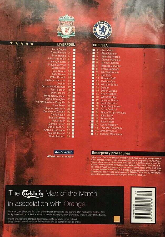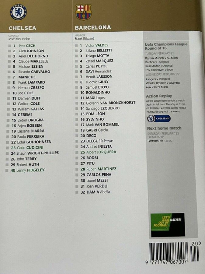 1 Petr Cech, 4 Claude Makelele, 5 Michael Essien, 6 Ricardo Carvalho, 8 Frank Lampard, 10 Joe Cole ( 9 Hernan Crespo 76), 13 William Gallas, 15 Didier Drogba ( 7 Maniche 85), 16 Arjen Robben (11 Damien Duff 66), 20 Paulo Ferreira, 26 John Terry |