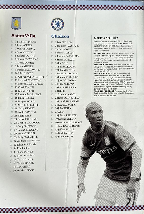 Brad Friedel, Luke Young, James M Collins, Richard Dunne, Stephen Warnock, Steve Sidwell, Stilian Petrov (Stewart Downing 62), Gabby Agbonlahor (Habib Beye 70), James Milner, Ashley Young, John Carew (Nathan Delfouneso 62) |