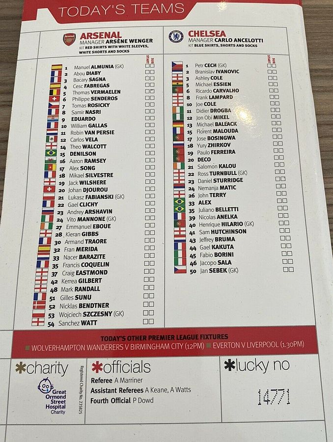 1 Petr Cech, 2 Branislav Ivanovic (17 Jose Bosingwa 46), 3 Ashley Cole, 5 Michael Essien, 6 Ricardo Carvalho, 8 Frank Lampard, 11 Didier Drogba, 12 Mikel Obi (13 Michael Ballack 65), 15 Florent Malouda (20 Anderson Deco 77), 26 John Terry, 39 Nicolas Anelka (21 Salomon Kalou 83) |
