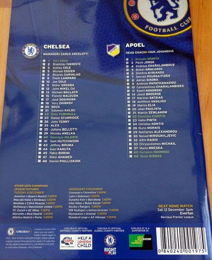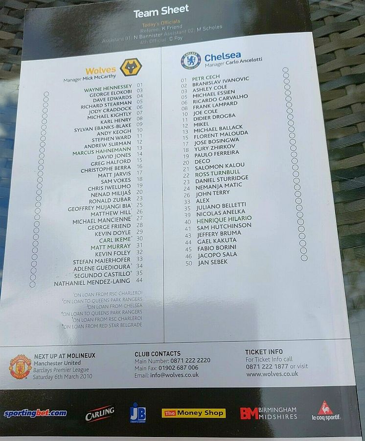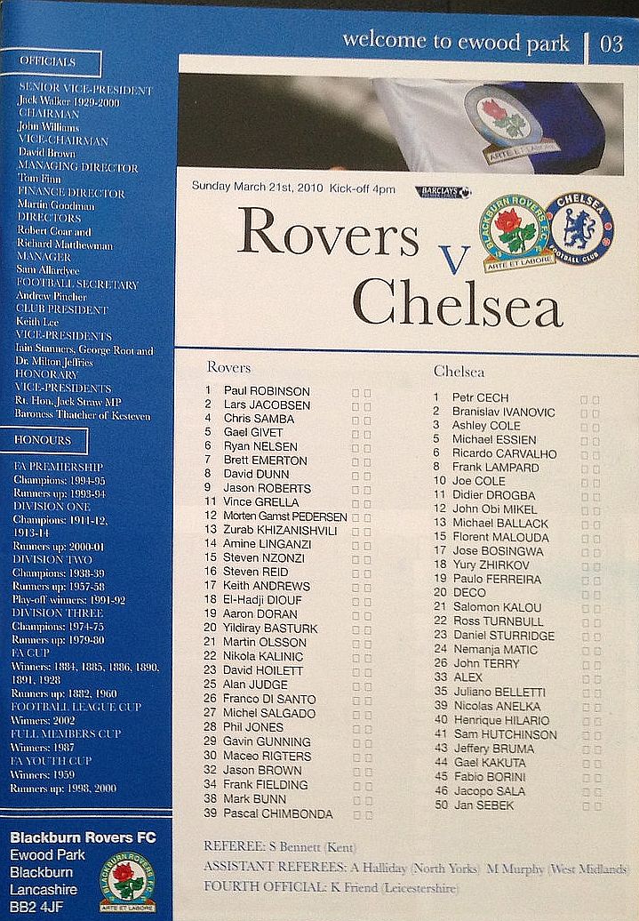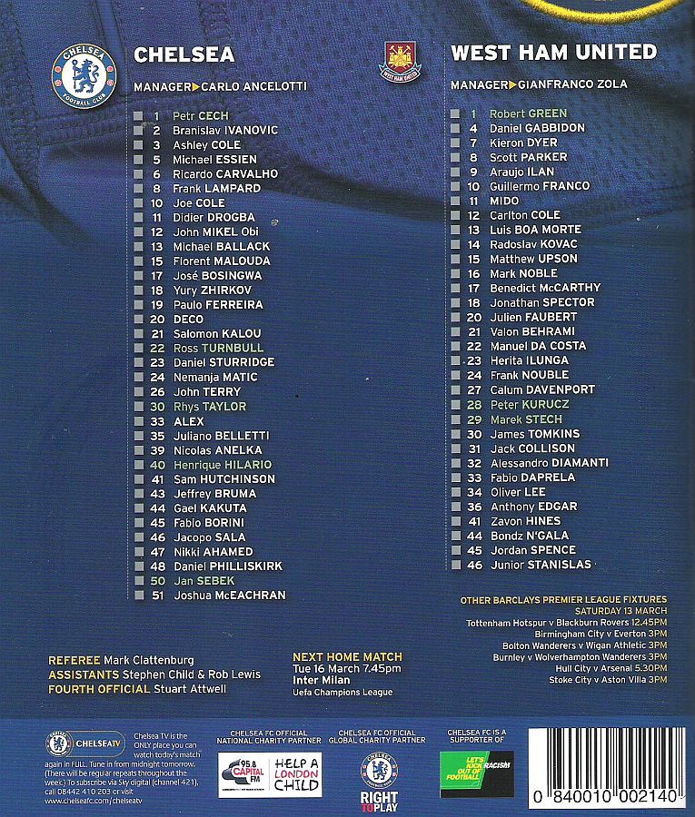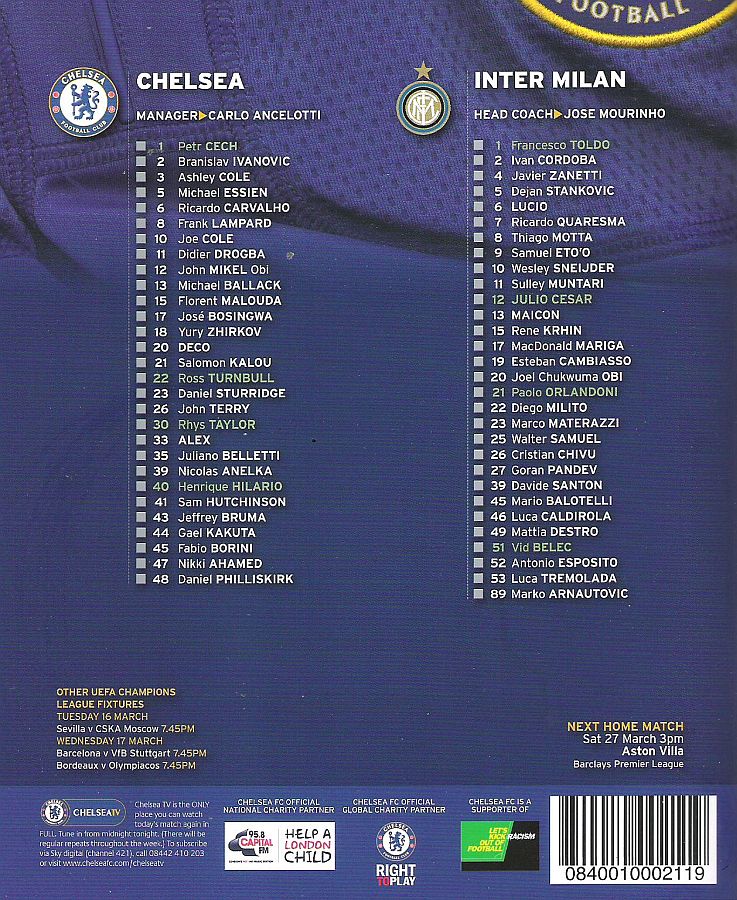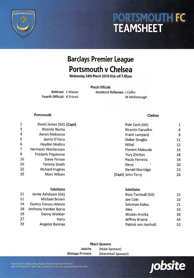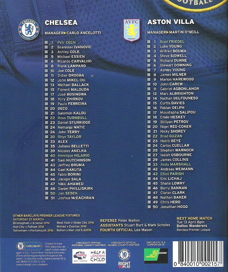 1 Petr Cech, 8 Frank Lampard, 10 Joe Cole (39 Nicolas Anelka 46), 11 Didier Drogba, 12 Mikel Obi (13 Michael Ballack 33), 15 Florent Malouda, 18 Yuri Zhirkov, 19 Paulo Ferreira ( 2 Branislav Ivanovic 46), 20 Anderson Deco, 26 John Terry, 33 Alex |