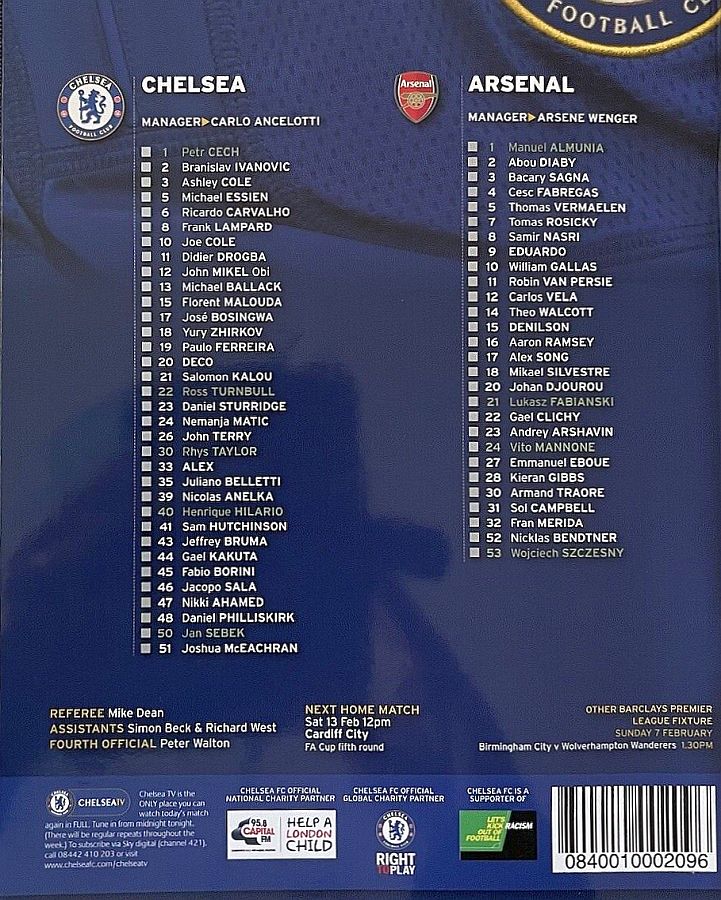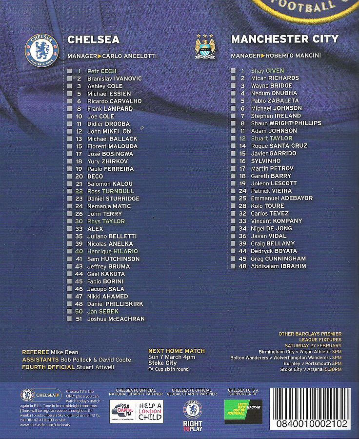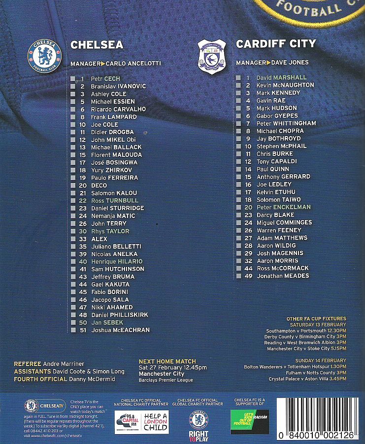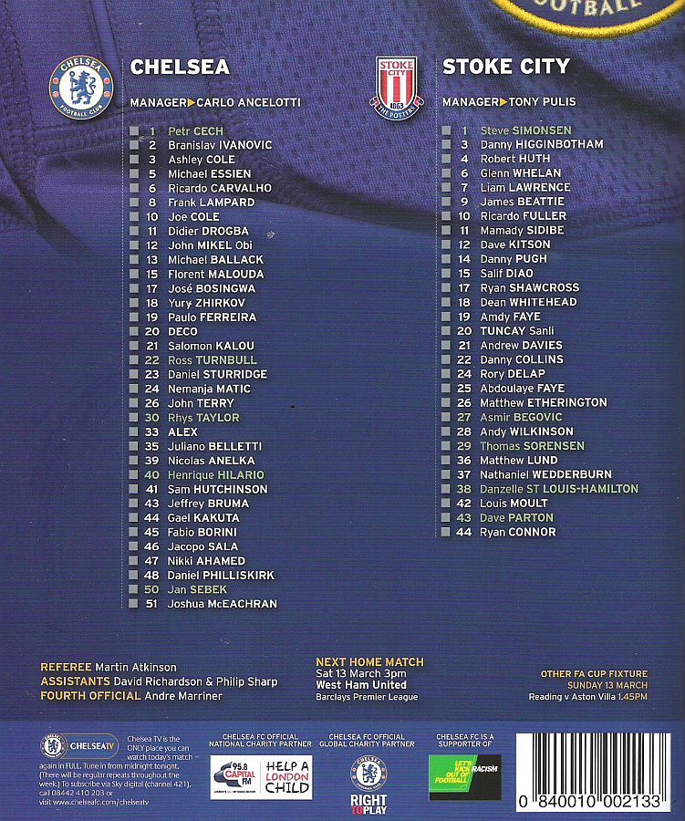 1 Petr Cech, 2 Branislav Ivanovic, 3 Ashley Cole, 8 Frank Lampard, 11 Didier Drogba, 13 Michael Ballack, 15 Florent Malouda, 19 Paulo Ferreira (41 Sam Hutchinson 73), 21 Salomon Kalou (10 Joe Cole 71), 33 Alex, 39 Nicolas Anelka (23 Daniel Sturridge 79) |