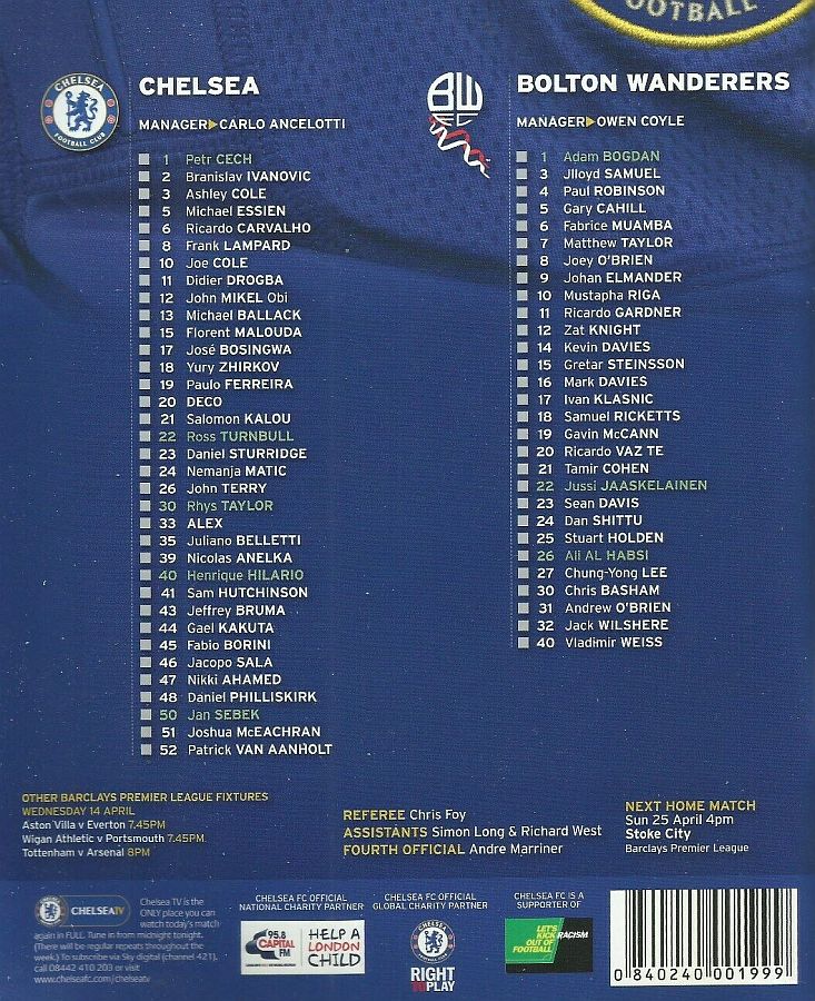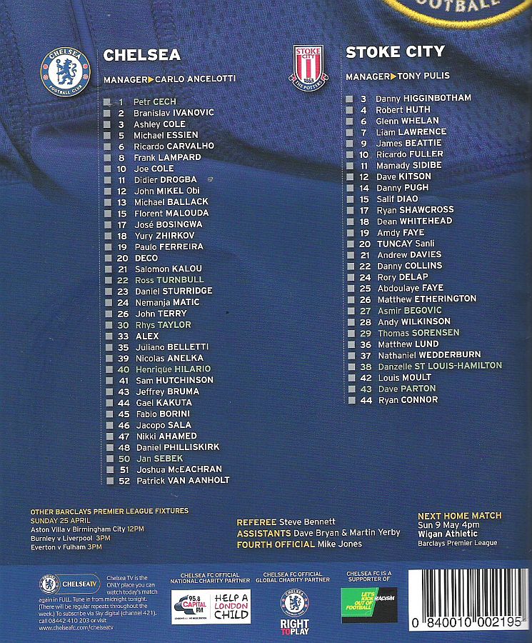 1 Petr Cech, 2 Branislav Ivanovic, 3 Ashley Cole, 8 Frank Lampard, 11 Didier Drogba, 13 Michael Ballack (35 Juliano Belletti 44), 15 Florent Malouda, 21 Salomon Kalou (10 Joe Cole 71), 26 John Terry, 33 Alex, 39 Nicolas Anelka (23 Daniel Sturridge 90) |