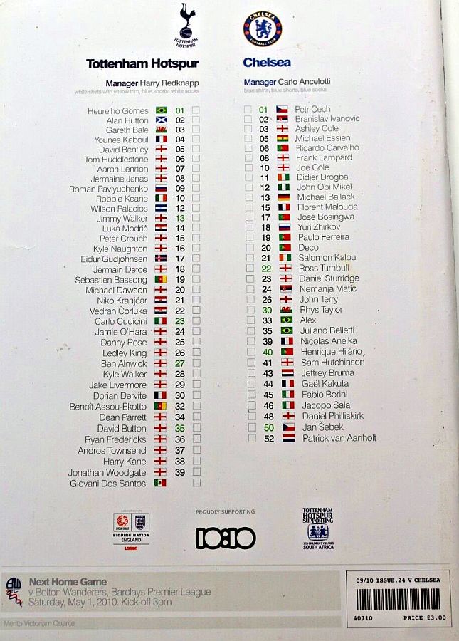 Heurelho Gomes, Younes Kaboul, Michael Dawson, Sebastien Bassong, Benoit Assou-Ekotto, David Bentley, Tom Huddlestone, Luka Modric, Gareth Bale, Roman Pavlyuchenko (Peter Crouch 90), Jermain Defoe (Eidur Gudjohnsen 78) |