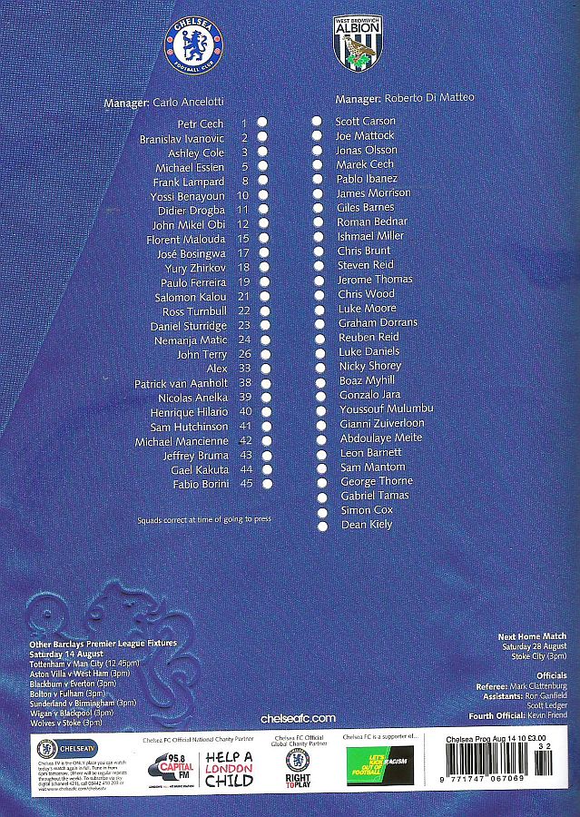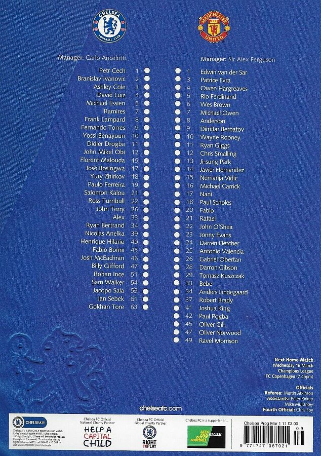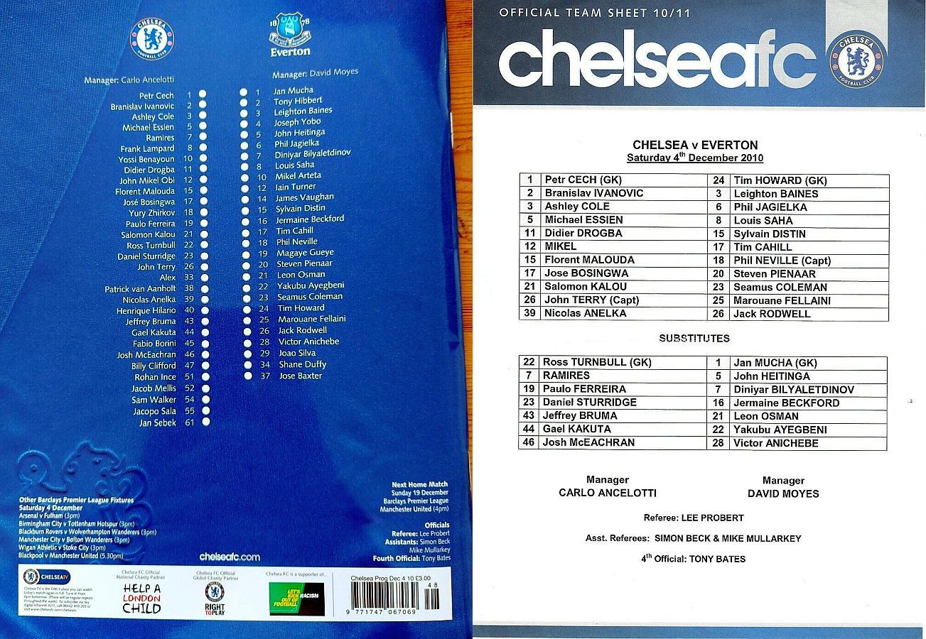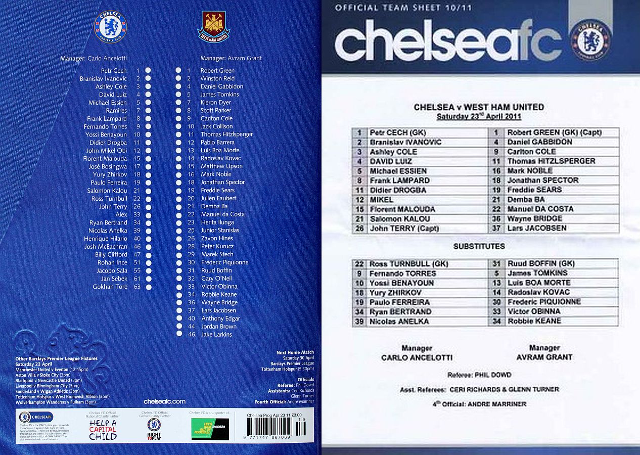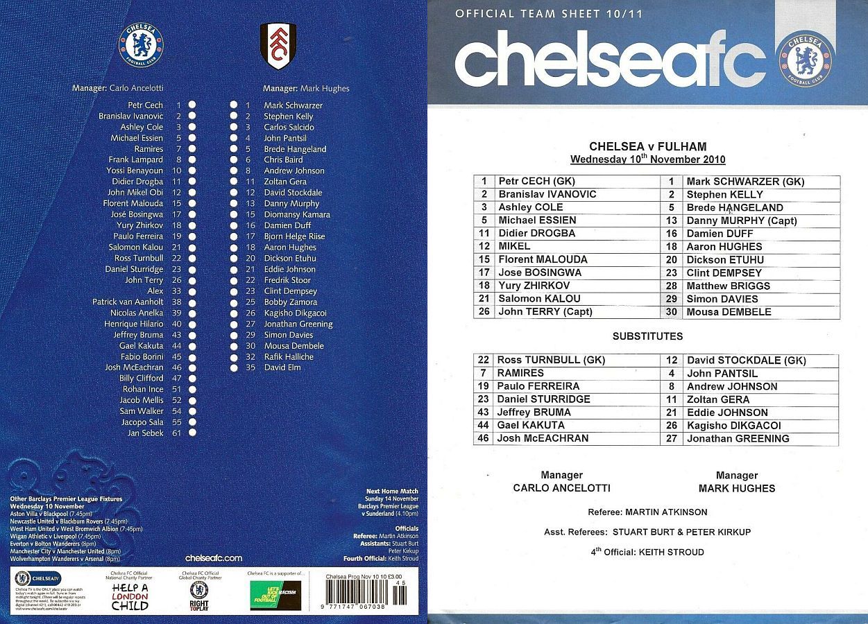 1 Petr Cech, 2 Branislav Ivanovic, 3 Ashley Cole, 5 Michael Essien (46 Josh McEachran 78), 8 Frank Lampard, 9 Fernando Torres, 12 Mikel Obi (21 Salomon Kalou 61), 15 Florent Malouda, 26 John Terry, 33 Alex (19 Paulo Ferreira 70), 39 Nicolas Anelka |