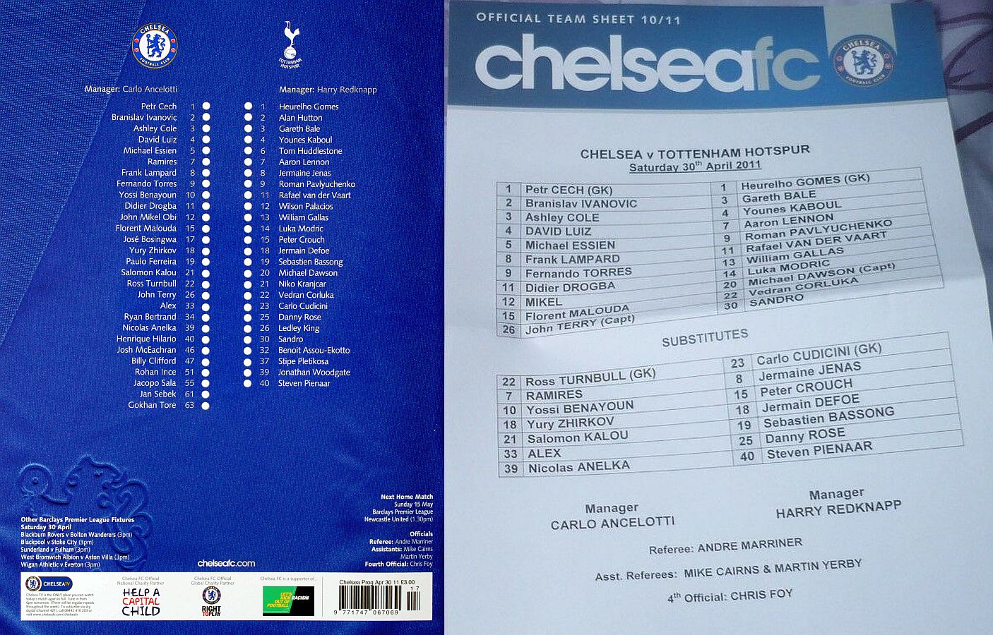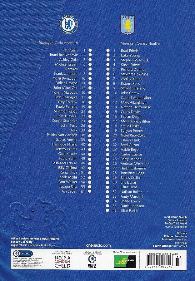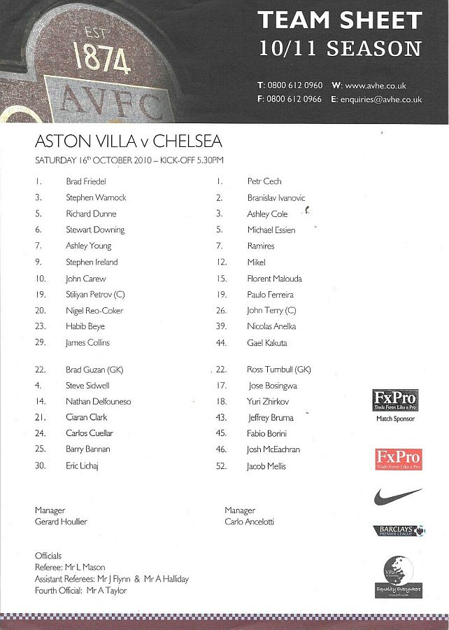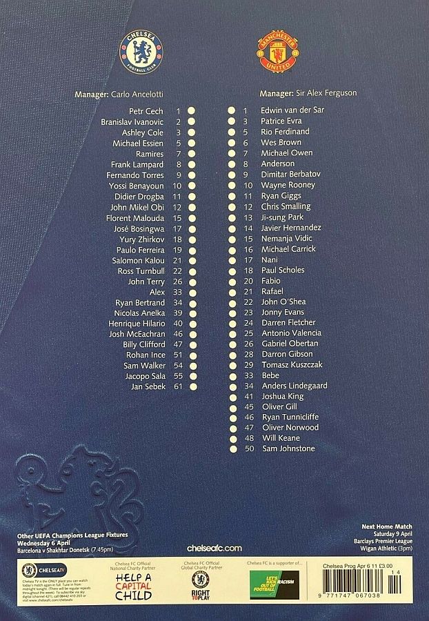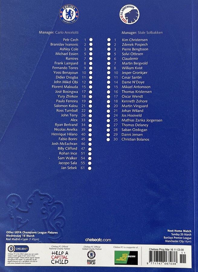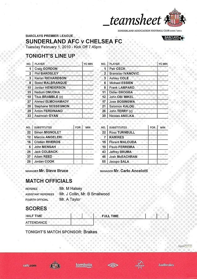 1 Petr Cech, 2 Branislav Ivanovic, 3 Ashley Cole, 5 Michael Essien (46 Josh McEachran 78), 8 Frank Lampard, 9 Fernando Torres, 12 Mikel Obi (21 Salomon Kalou 61), 15 Florent Malouda, 26 John Terry, 33 Alex (19 Paulo Ferreira 70), 39 Nicolas Anelka |