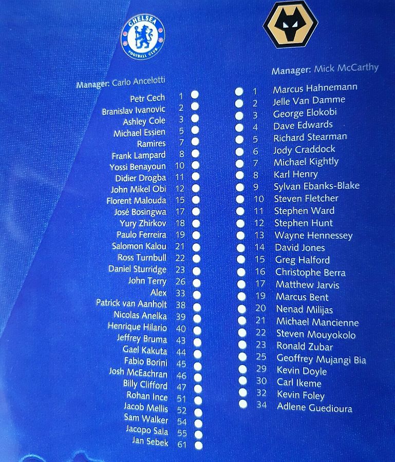 1 Petr Cech, 2 Branislav Ivanovic (19 Paulo Ferreira 63), 3 Ashley Cole, 5 Michael Essien (10 Yossi Benayoun 80), 8 Frank Lampard, 11 Didier Drogba, 12 Mikel Obi, 15 Florent Malouda (21 Salomon Kalou 70), 26 John Terry, 33 Alex, 39 Nicolas Anelka |