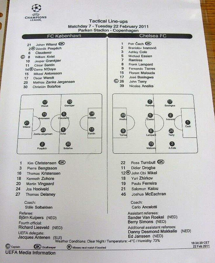 1 Petr Cech, 2 Branislav Ivanovic, 3 Ashley Cole, 4 David Luiz (33 Alex 46), 5 Michael Essien, 8 Frank Lampard, 11 Didier Drogba, 12 Mikel Obi ( 7 Ramires 46), 15 Florent Malouda, 21 Salomon Kalou ( 9 Fernando Torres 62), 26 John Terry |