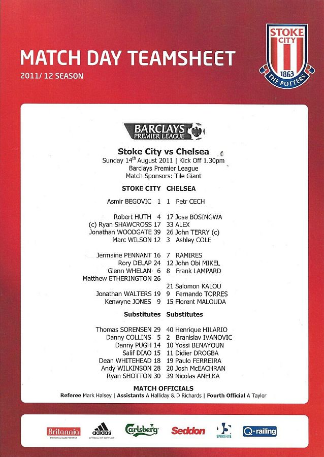 Asmir Begovic, Robert Huth, Ryan Shawcross, Jonathan Woodgate, Marc Wilson, Jermaine Pennant, Rory Delap (Danny Pugh 71), Glenn Whelan, Matthew Etherington (Dean Whitehead 62), Kenwyne Jones (Ryan Shotton 86), Jon Walters |
