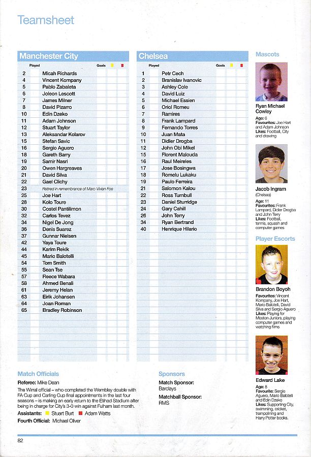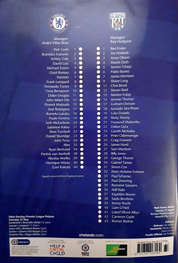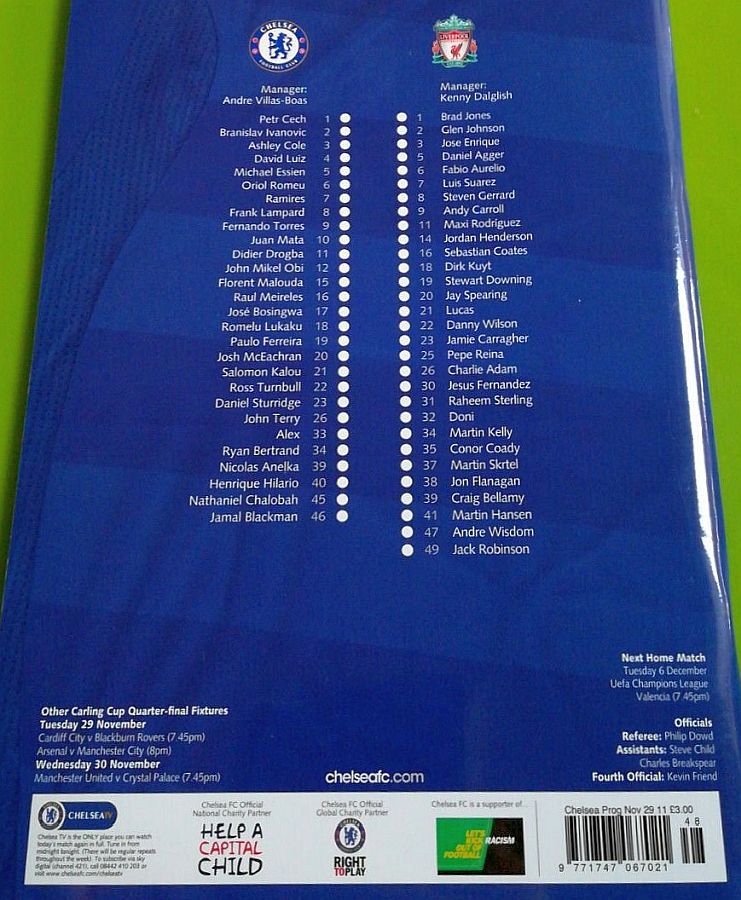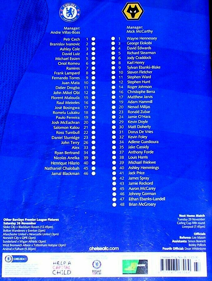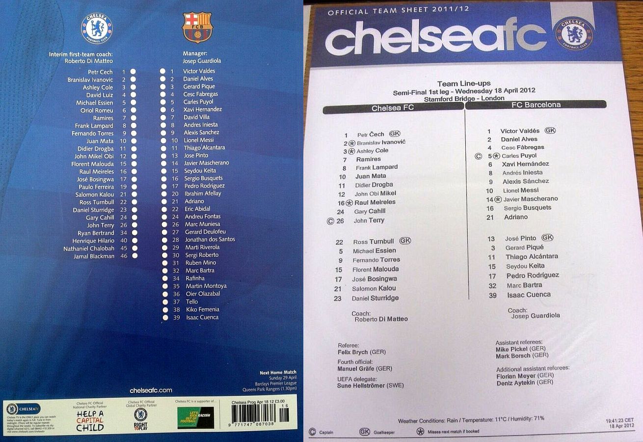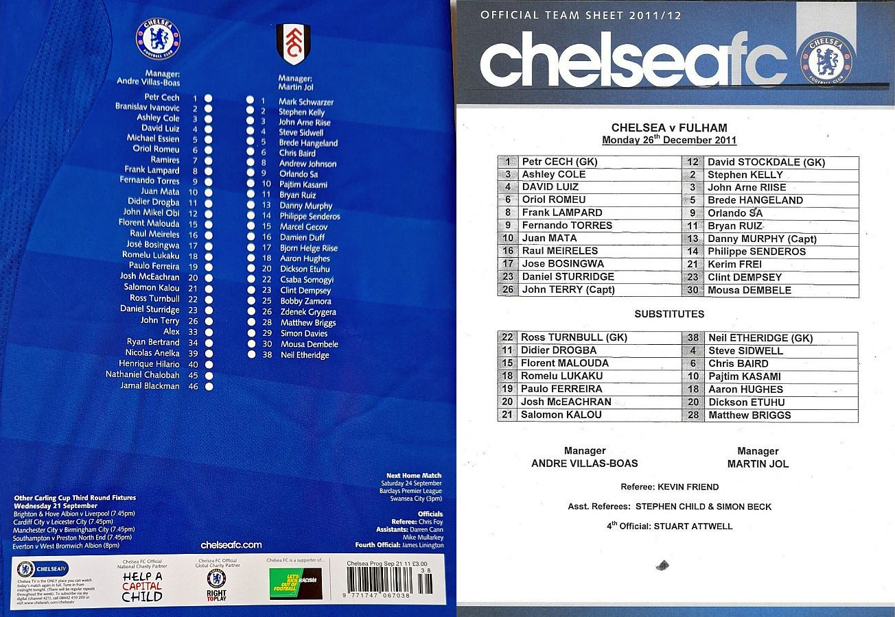 1 Petr Cech, 3 Ashley Cole, 5 Michael Essien, 8 Frank Lampard, 9 Fernando Torres, 10 Juan Mata (15 Florent Malouda 68), 17 Jose Bosingwa (27 Sam Hutchinson 82), 19 Paulo Ferreira, 21 Salomon Kalou ( 7 Ramires 73), 23 Daniel Sturridge, 26 John Terry |