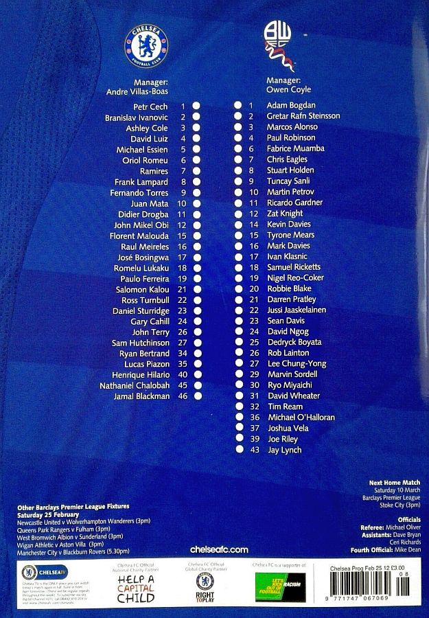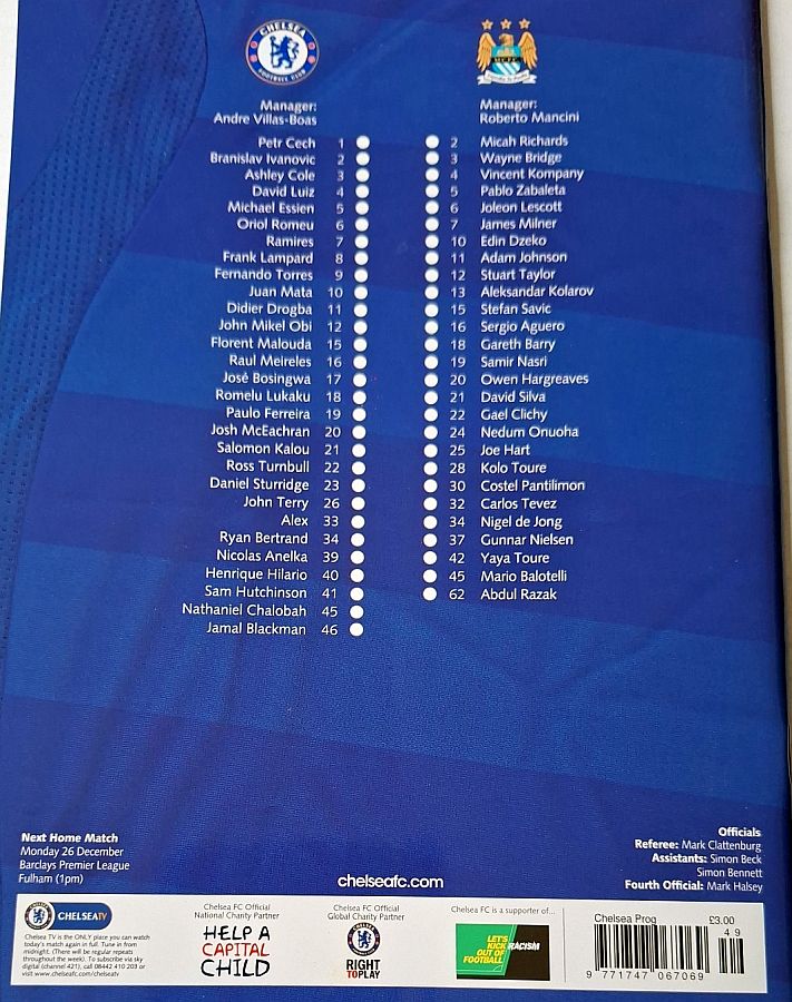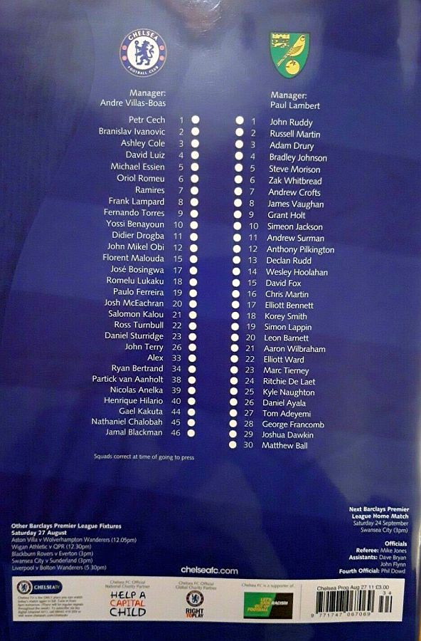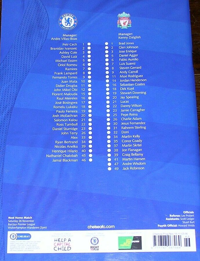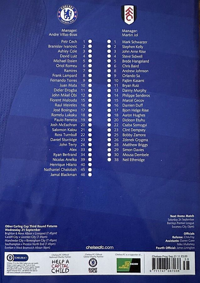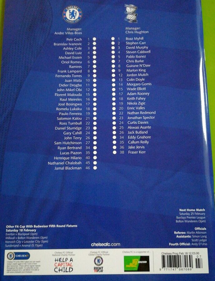22 Ross Turnbull, 2 Branislav Ivanovic, 5 Michael Essien, 6 Oriol Romeu, 7 Ramires, 9 Fernando Torres, 15 Florent Malouda, 19 Paulo Ferreira, 23 Daniel Sturridge (18 Romelu Lukaku 68), 26 John Terry, 34 Ryan Bertrand |