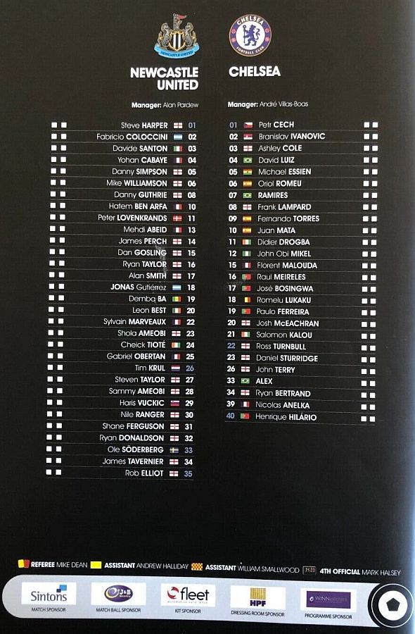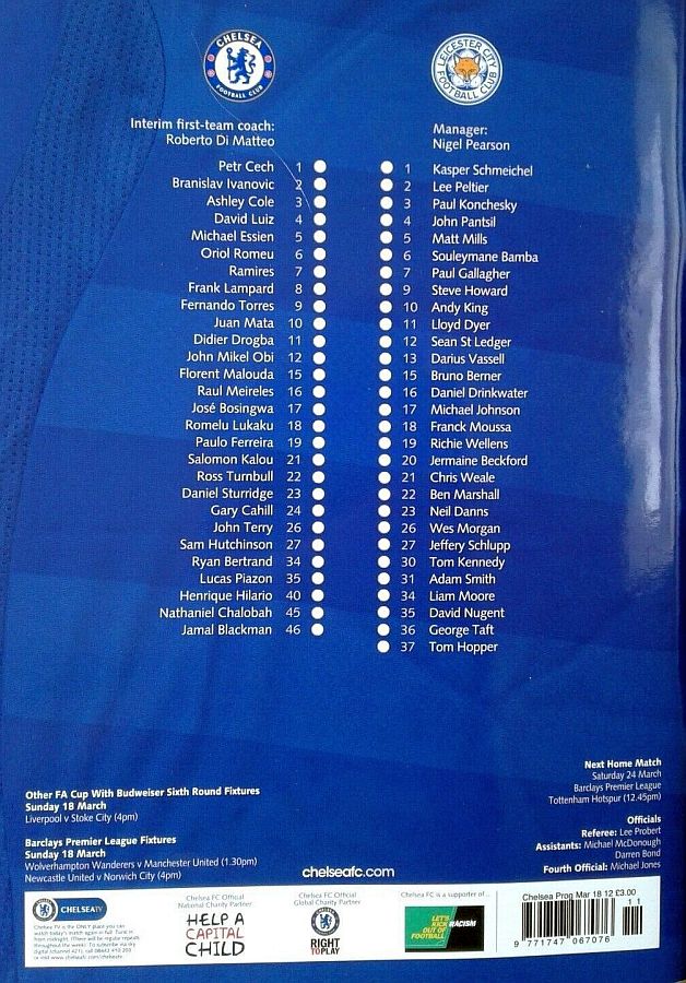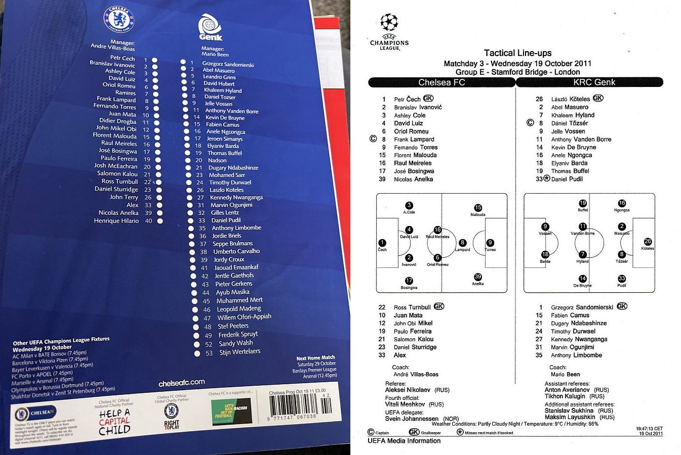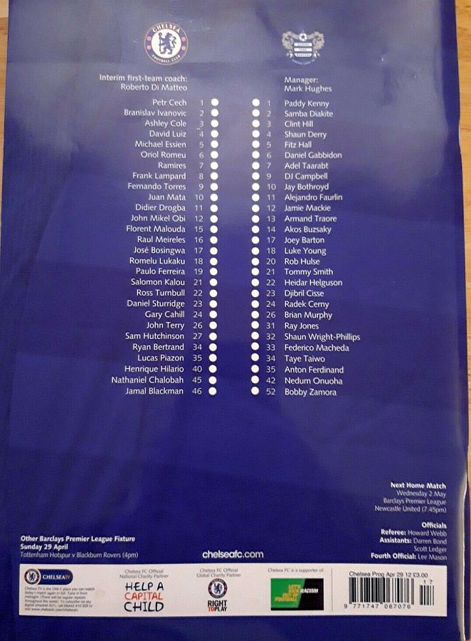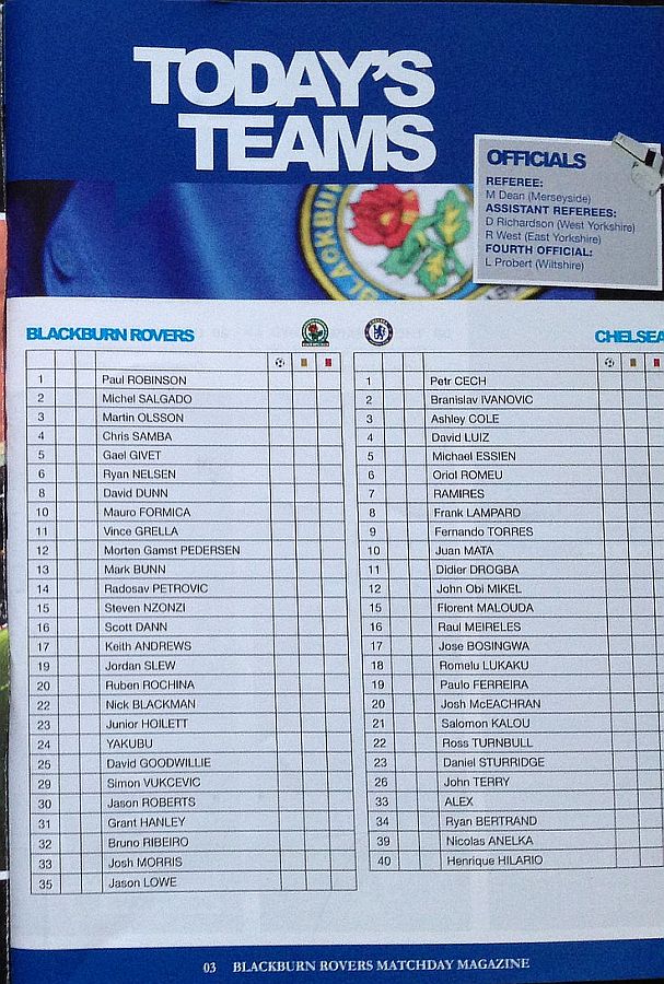 40 Henrique Hilario, 3 Ashley Cole, 8 Frank Lampard, 10 Juan Mata, 21 Salomon Kalou, 27 Sam Hutchinson |