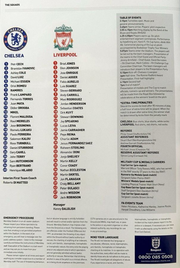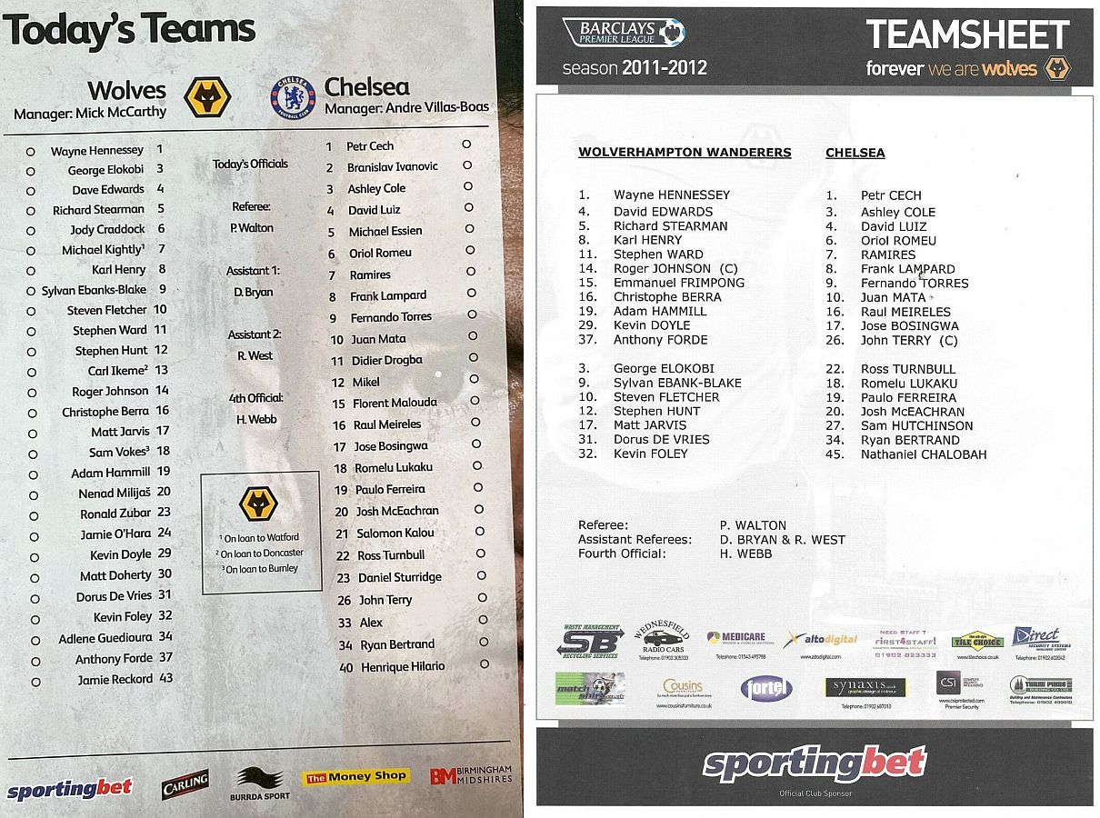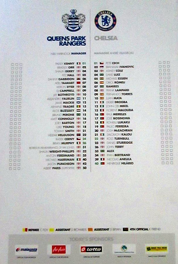 1 Petr Cech, 2 Branislav Ivanovic, 7 Ramires, 9 Fernando Torres, 12 Mikel Obi, 15 Florent Malouda (11 Didier Drogba 61), 16 Raul Meireles ( 8 Frank Lampard 78), 17 Jose Bosingwa, 23 Daniel Sturridge (10 Juan Mata 46), 26 John Terry, 34 Ryan Bertrand |